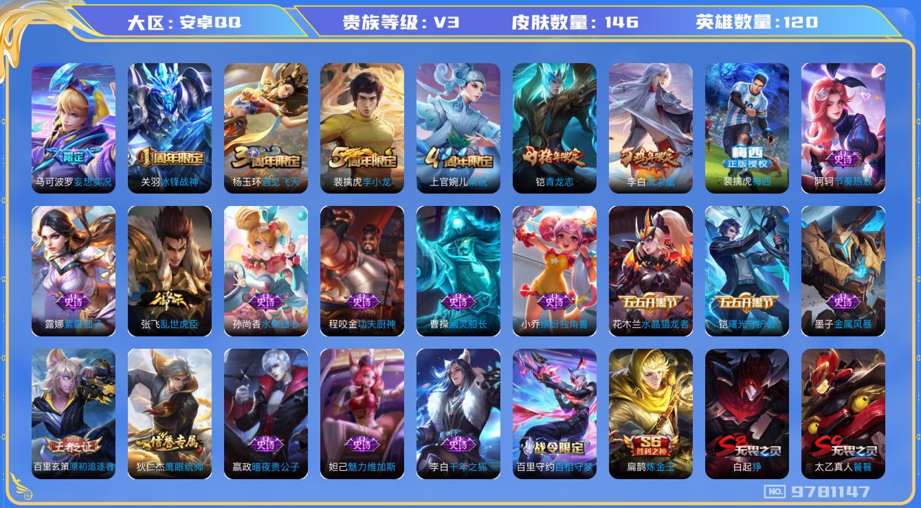 4金标-安卓Q-V8-285皮肤-1典藏英雄-15传说-77史诗-2星传说-2