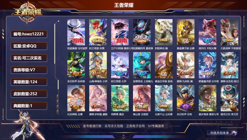 安卓QQ/荣耀王者/252皮肤/124英雄/1典藏/0珍品无双/0无双/3珍品传说/17传说/65史