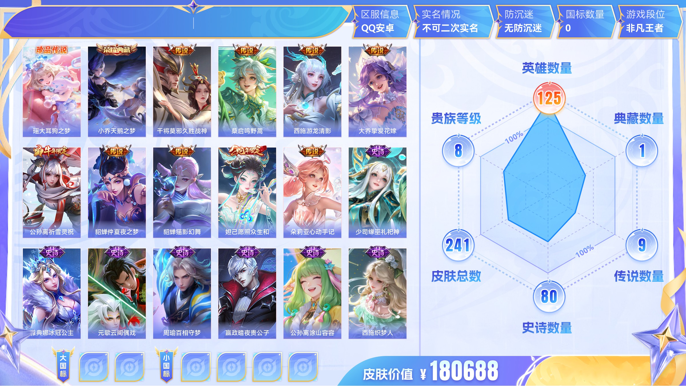 实名: 可修改 贵族等级: V8 英雄数: 125 皮肤数: 187 荣耀水晶