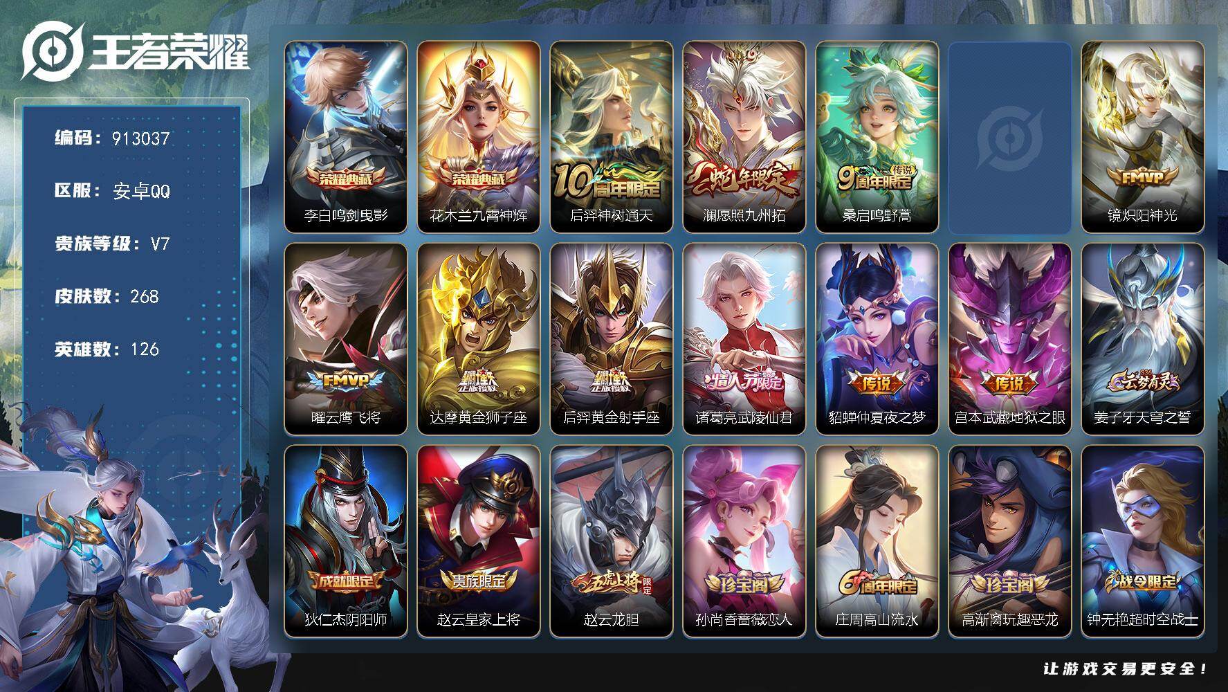 【秒换绑】安卓Q-V7-最强王者段位-127英雄-128皮肤-1典藏皮肤-1无