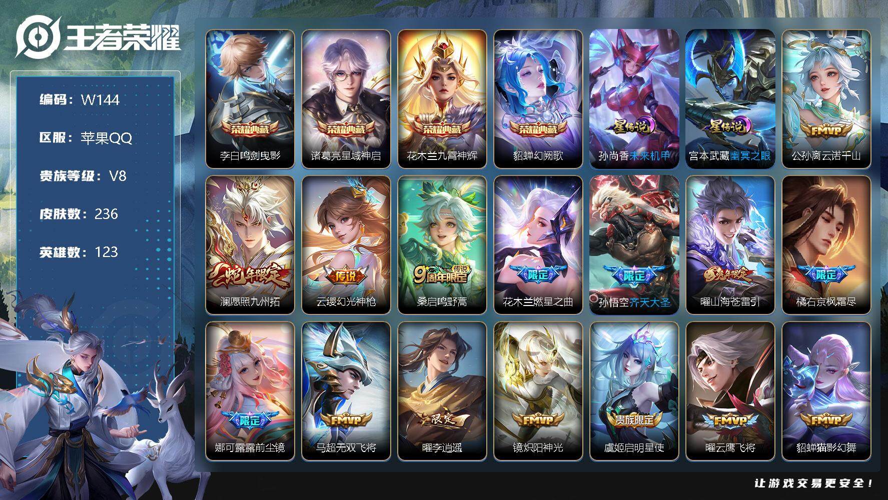 【W144】打野36段-苹果QQ-无二次-贵8-123英雄-236皮肤-4典藏