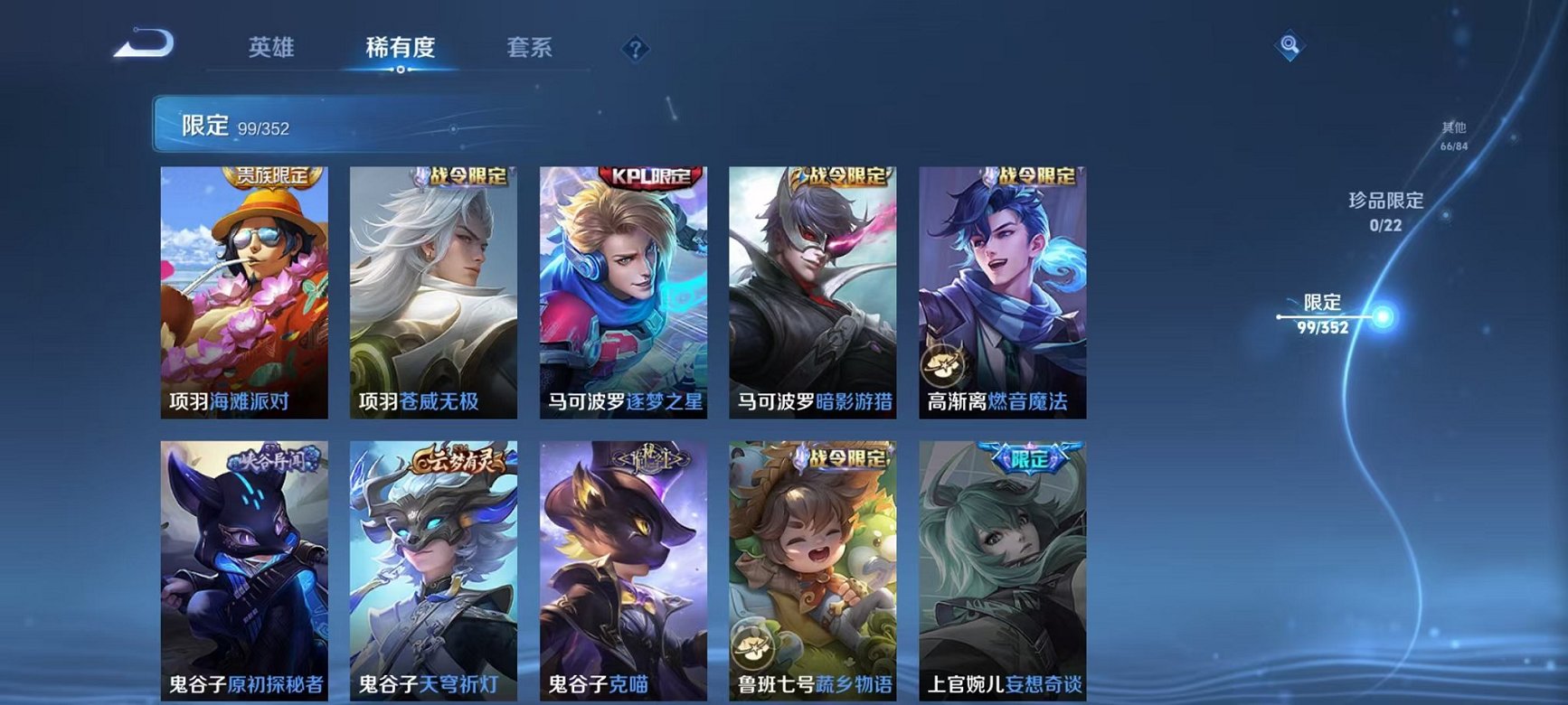 安卓QQ 皮肤289 英雄126 典藏1 珍品传说1 传说12 其他皮肤85 绝世王者-