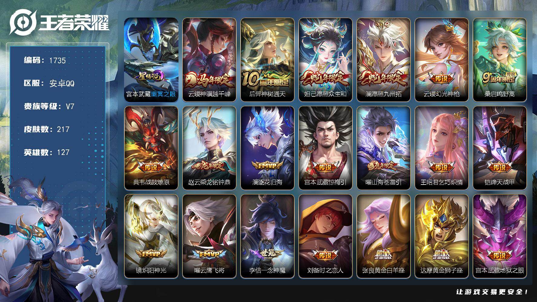 可二次 V7 贵族积分39174 安卓QQ/269皮肤/129英雄
