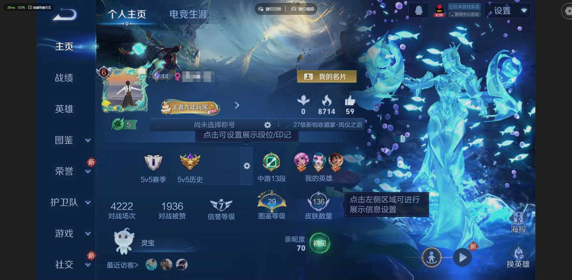 实名: 可修改 贵族等级: V7 英雄数: 119 皮肤数: 136 荣耀水晶