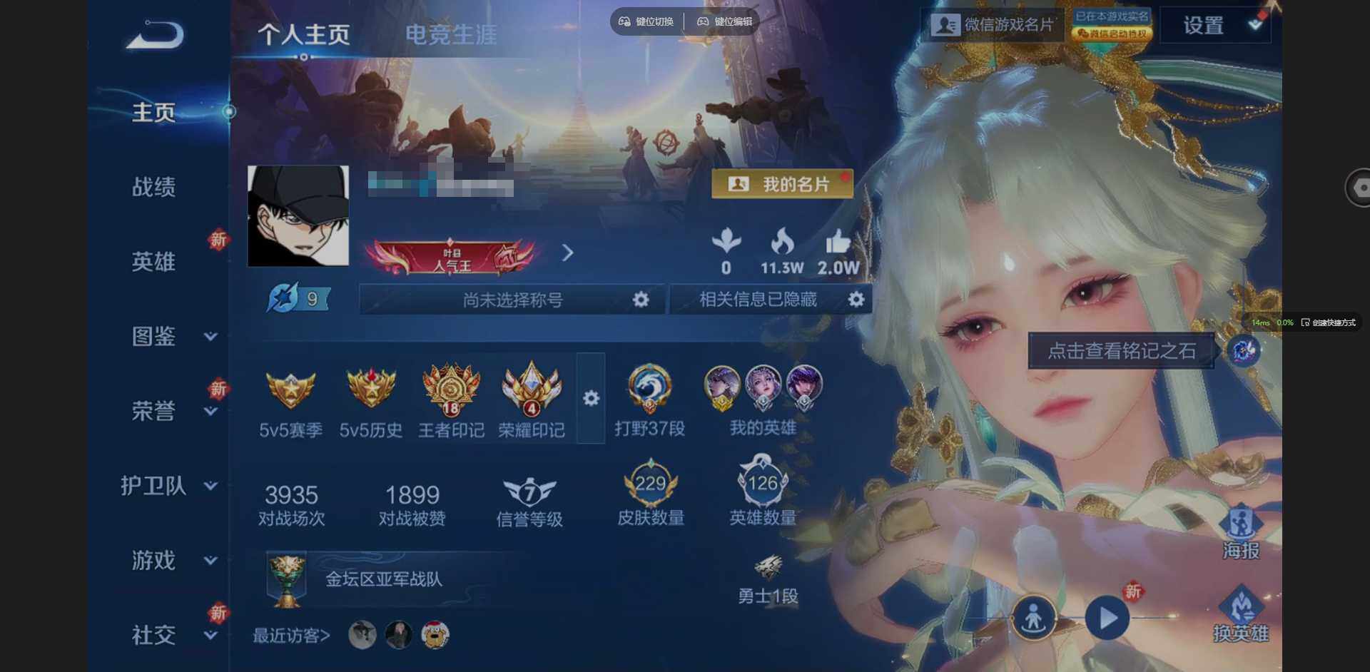至尊星耀/269皮肤/126英雄/2典藏/0珍品无双/0无双/1珍品传说/17传说/66史诗/7稀有英雄