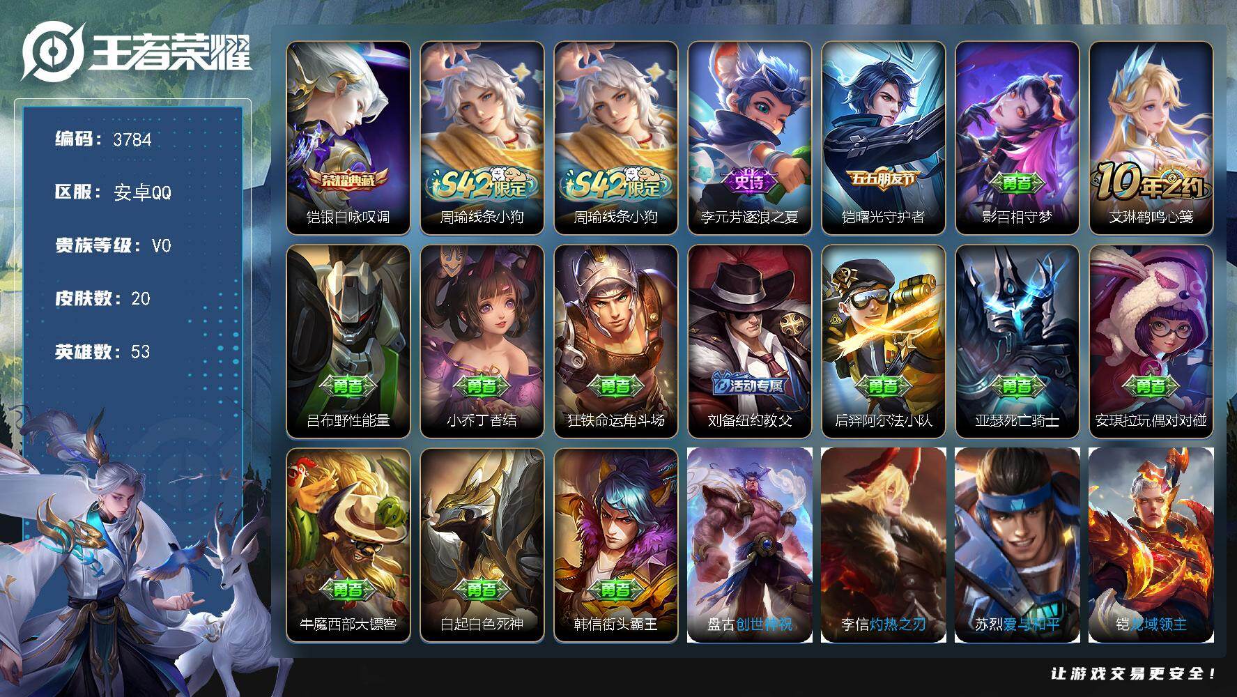 安卓Q-V0-尊贵铂金II段位-53英雄-20皮肤-1典藏皮肤-2史诗【荣耀
