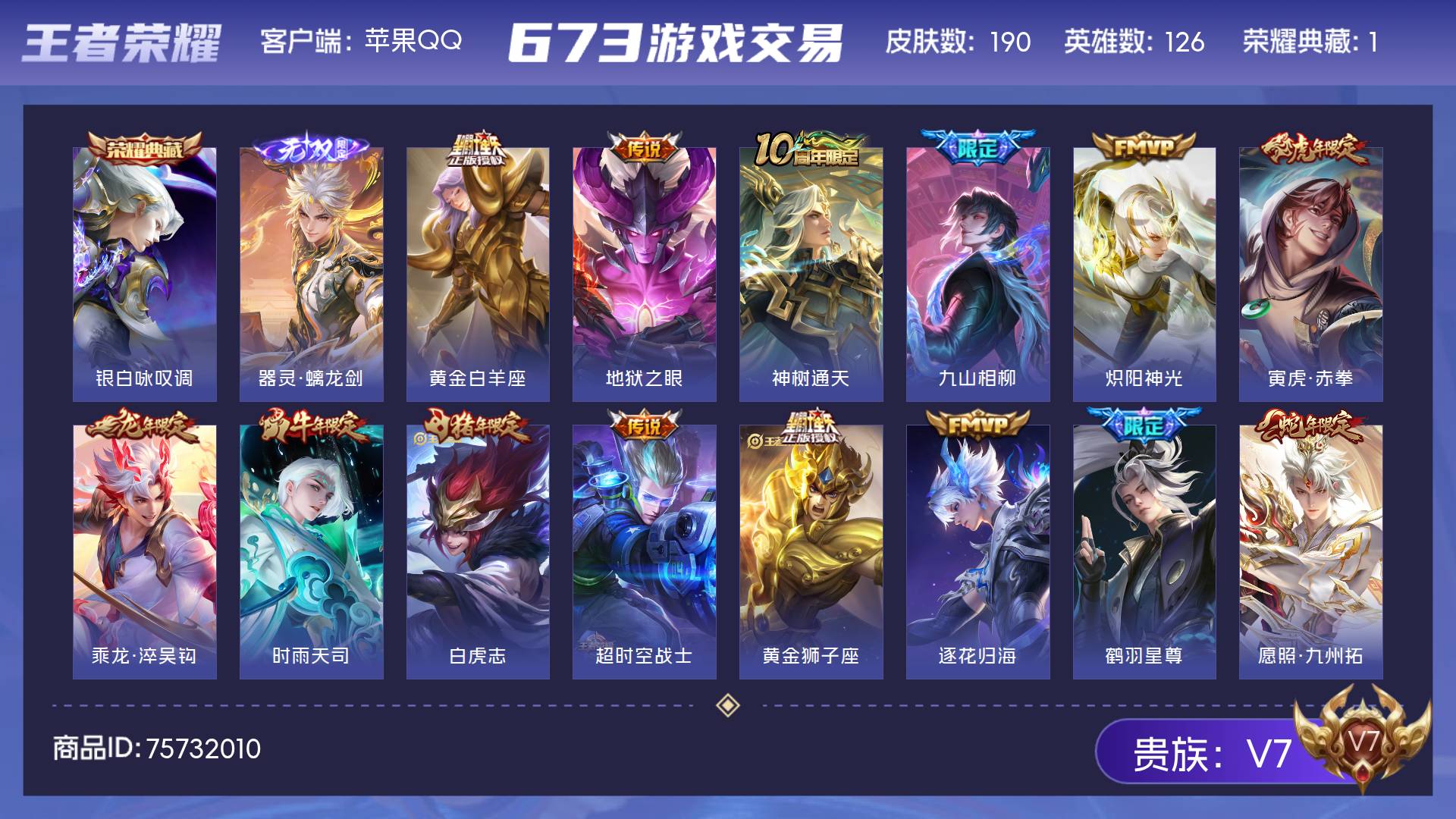 V7 皮肤190 英雄126 至尊星耀 荣耀典藏1 无双皮肤1 传说14 其他皮肤178