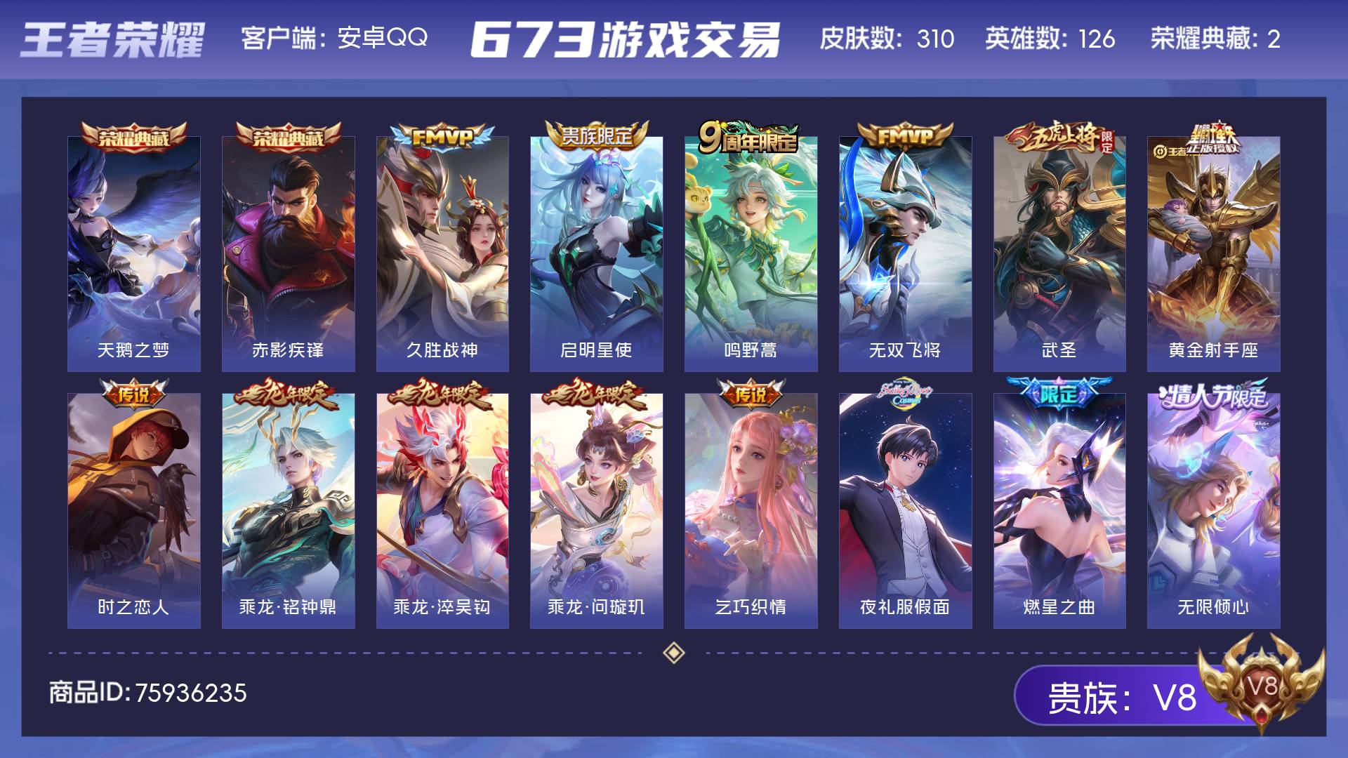 V8 皮肤310 英雄126 无双王者 荣耀典藏2 传说19 其他皮肤296
