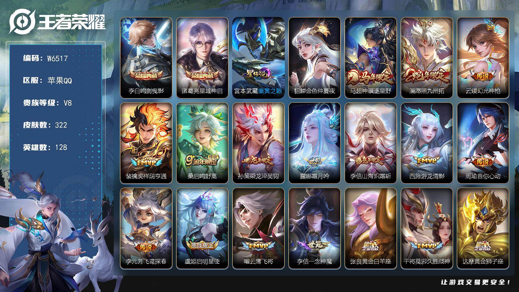苹果QQ/至尊星耀/192皮肤/128英雄/2典藏/0珍品无双/1无双/2珍品传说/8传说/57史诗