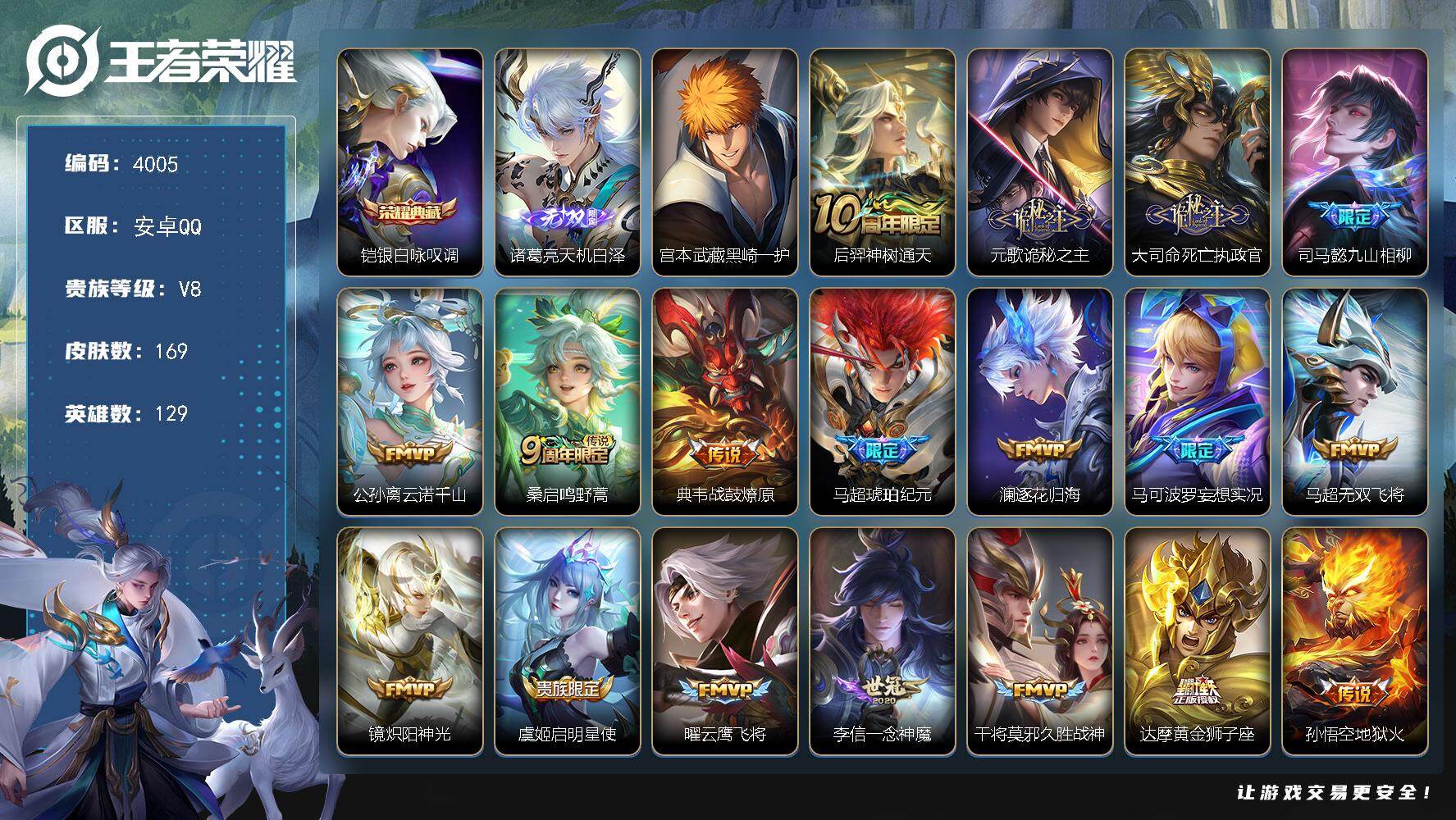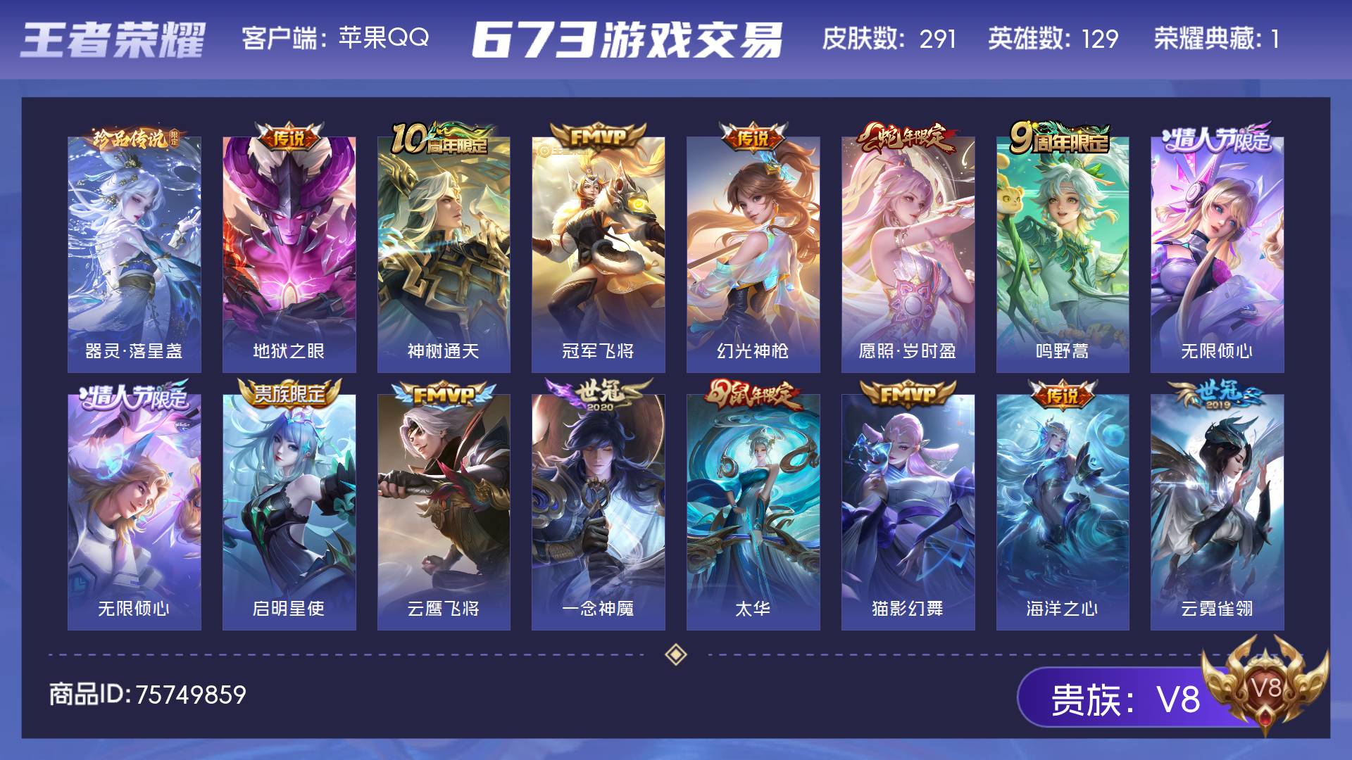 V8 皮肤291 英雄129 至尊星耀 荣耀典藏1 珍品传说1 传说20 其他皮肤275