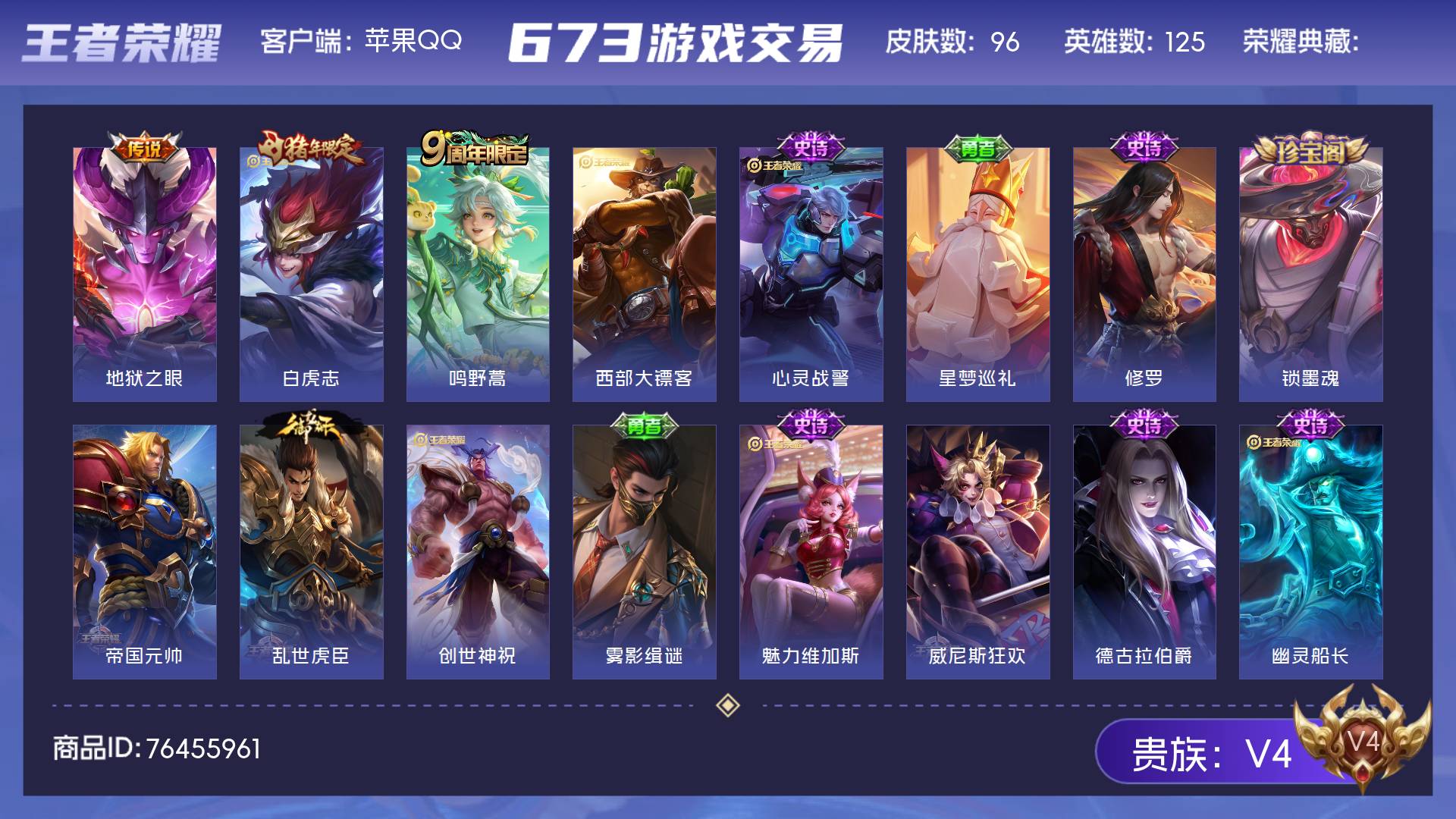 V4 皮肤96 英雄125 至尊星耀 传说3