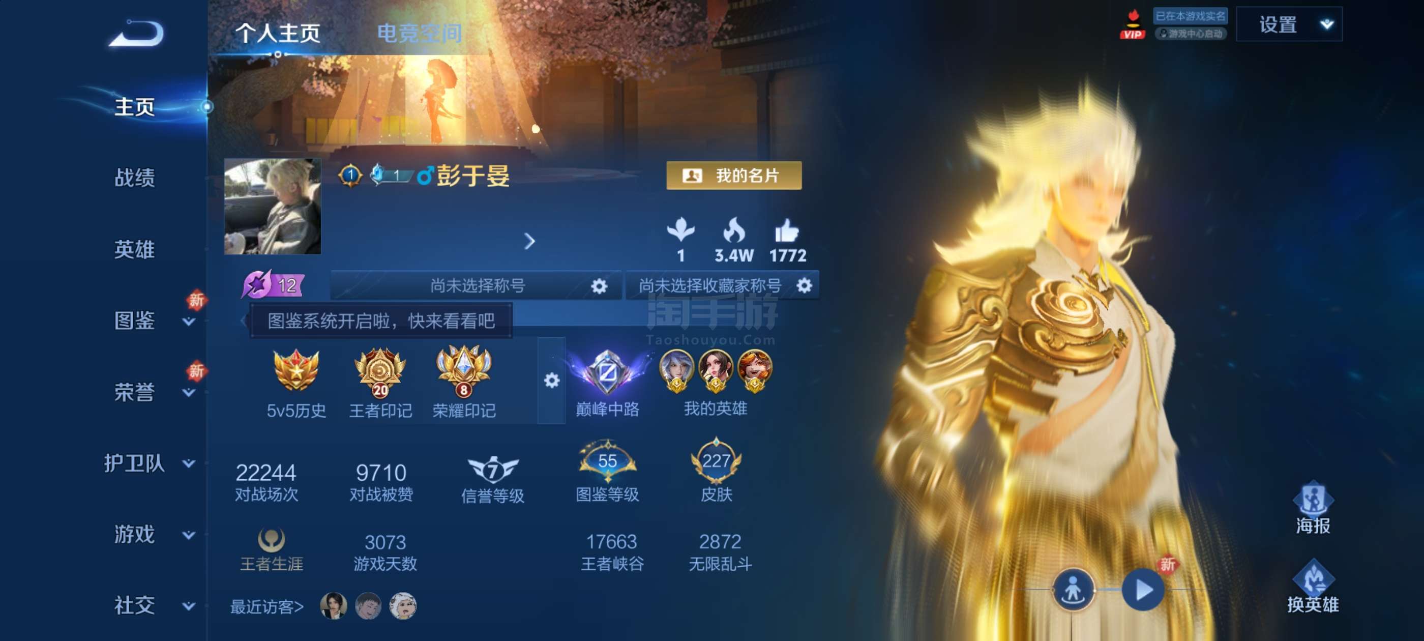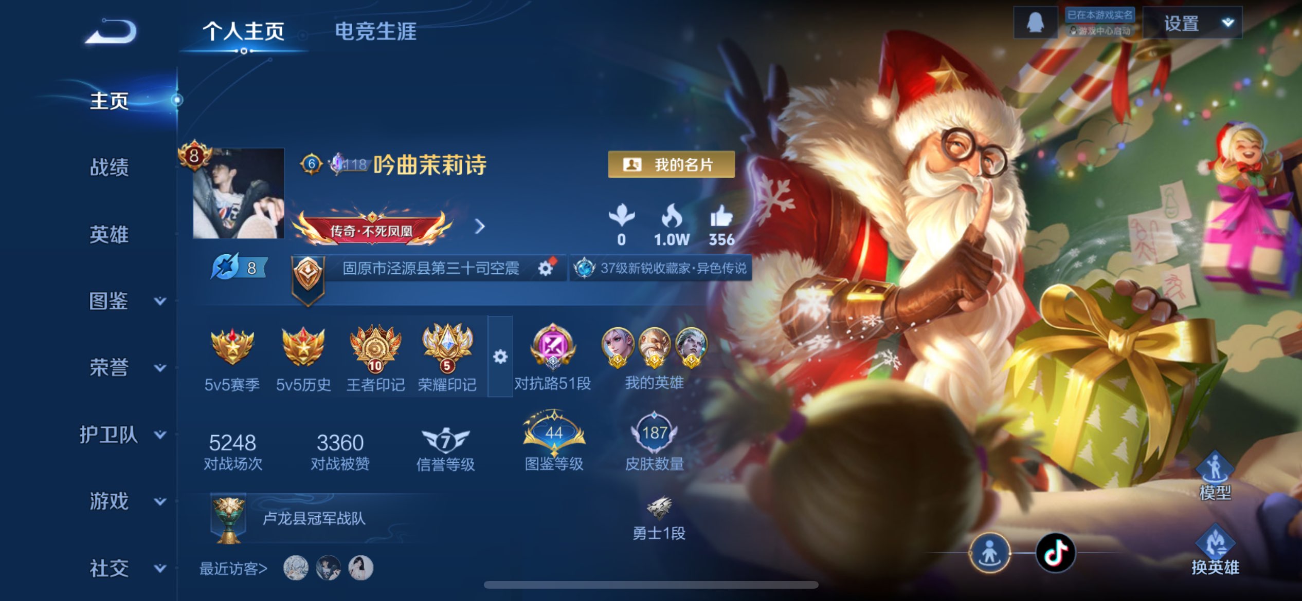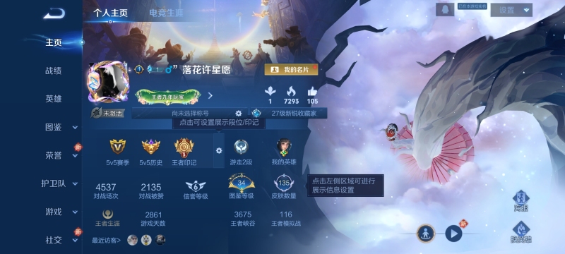 实名: 可修改 贵族等级: V8 英雄数: 127 皮肤数: 275 荣耀水晶