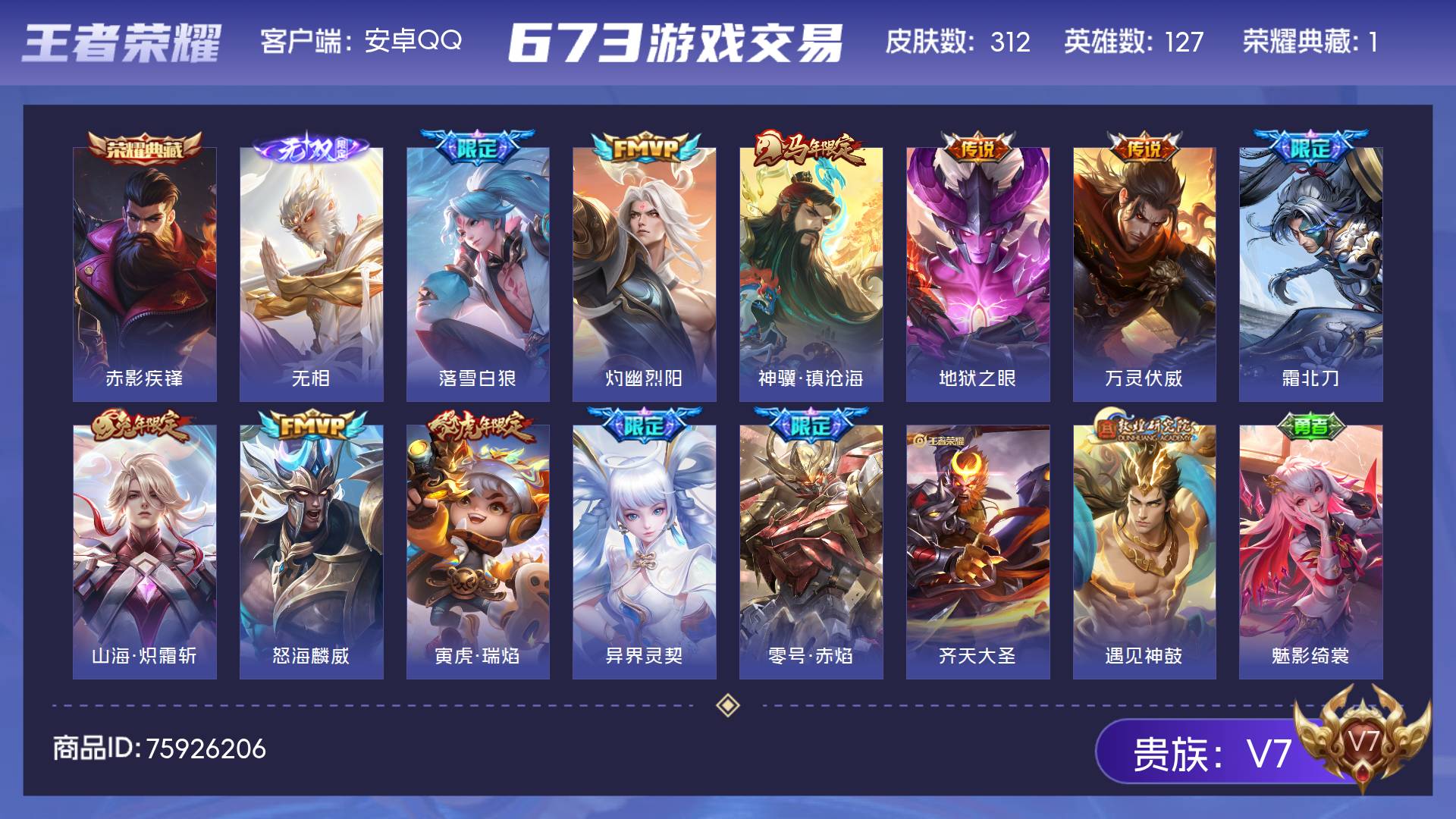 V7 皮肤312 英雄127 最强王者 荣耀典藏1 无双皮肤1 传说13 其他皮肤303