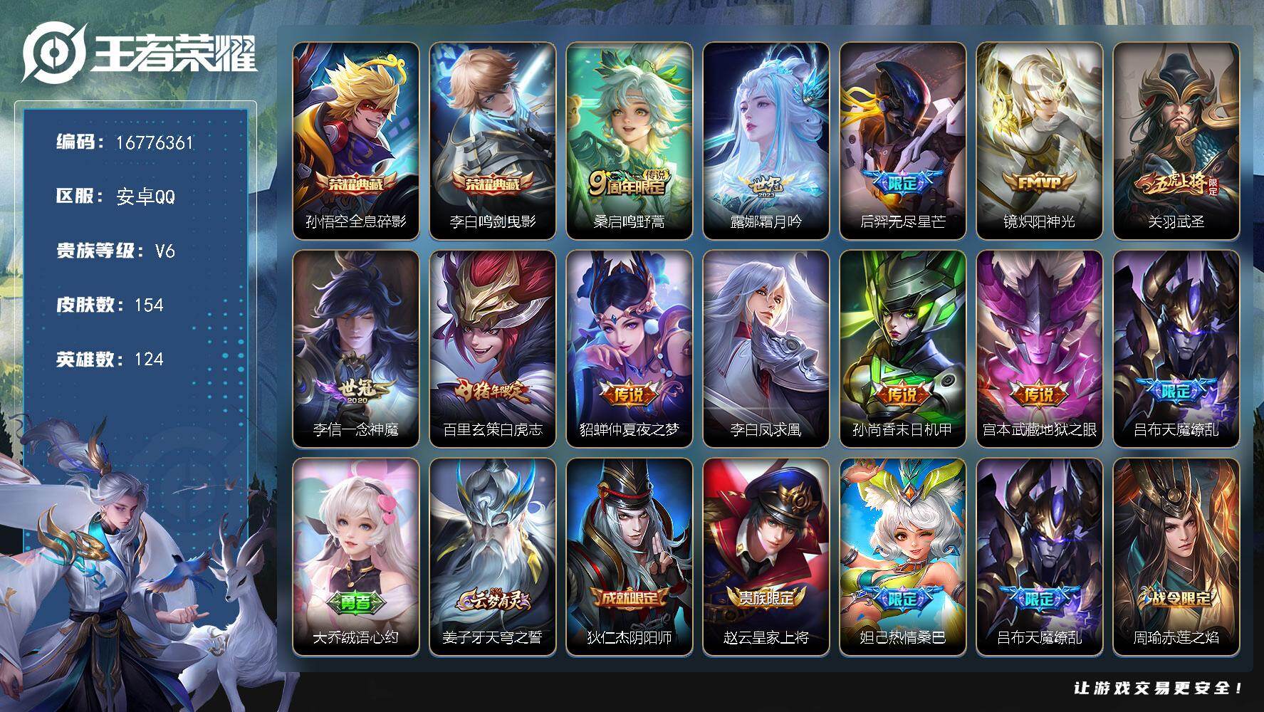 【16776361】安卓Q-V6-永恒钻石III段位-124英雄-154皮肤-