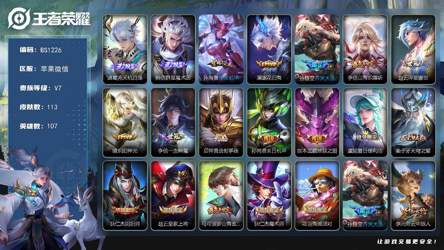 苹果WX-V7-最强王者段位-107英雄-113皮肤-2无双-9传说-34史诗
