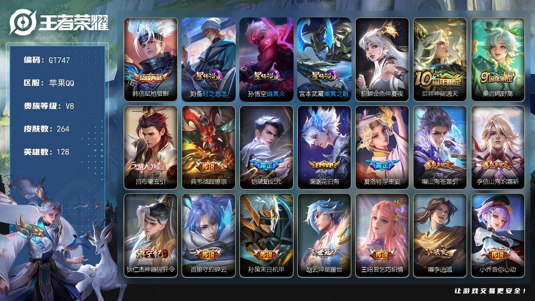 苹果Q-V8-最强王者段位-128英雄-229皮肤-2典藏皮肤-1无双-23传