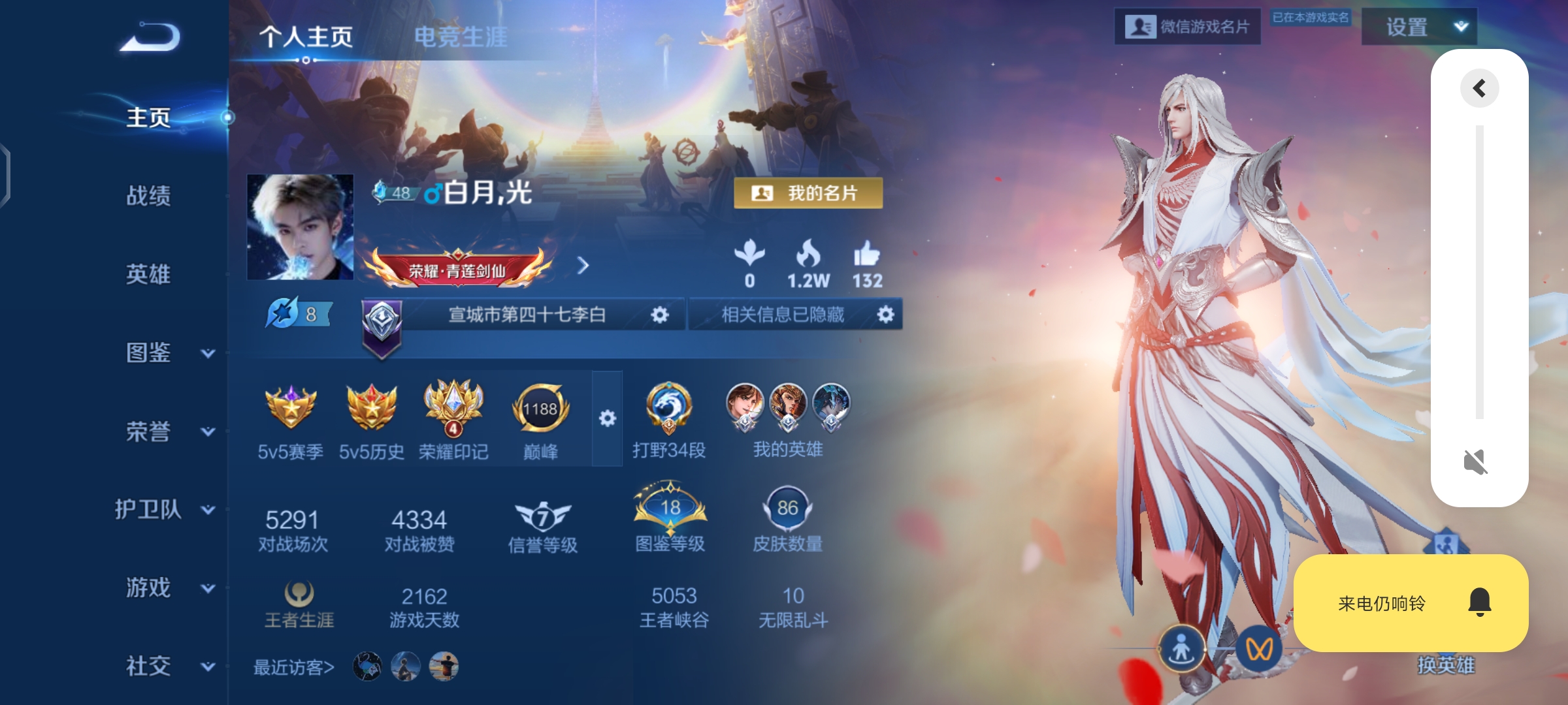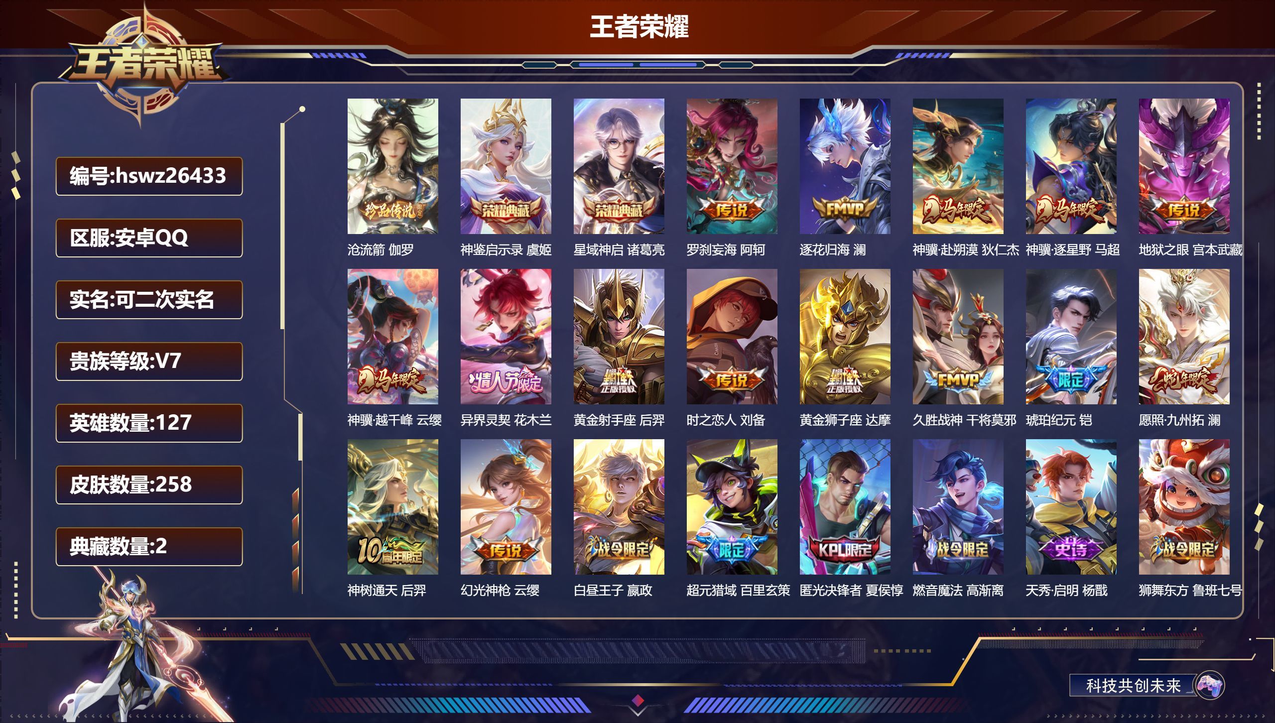 安卓QQ/传奇王者/258皮肤/127英雄/2典藏/0珍品无双/0无双/1珍品传说/15传说/55史