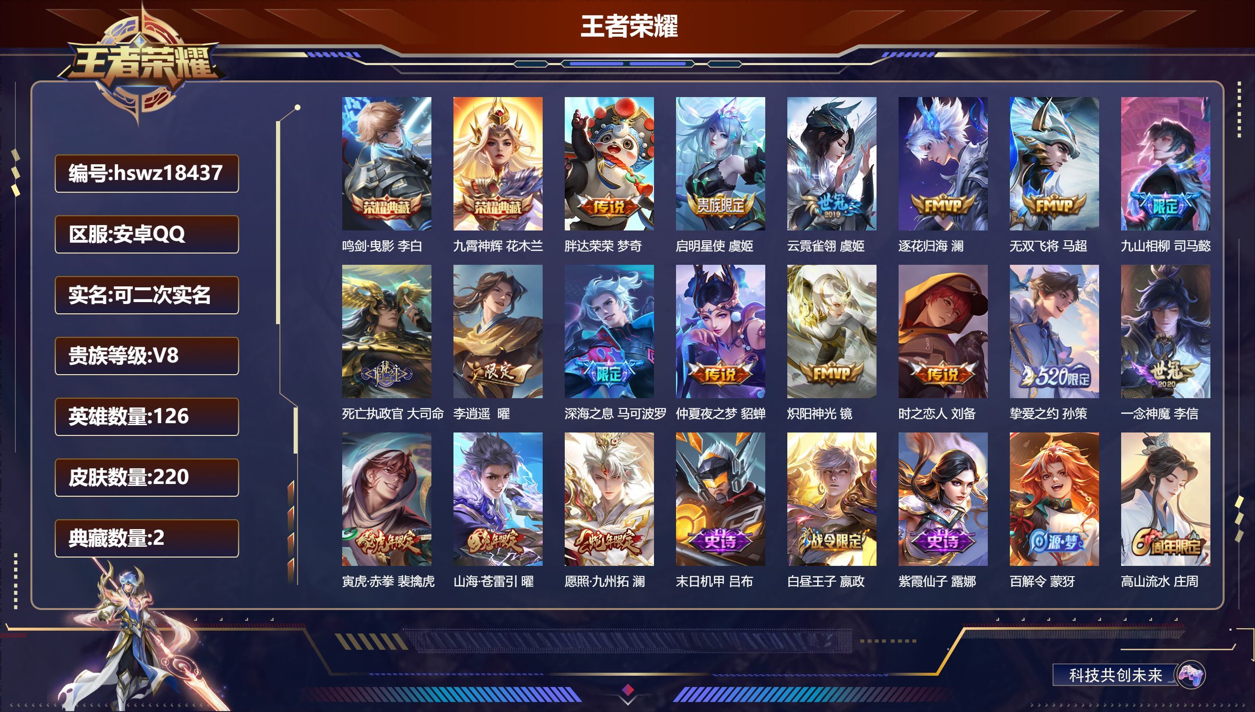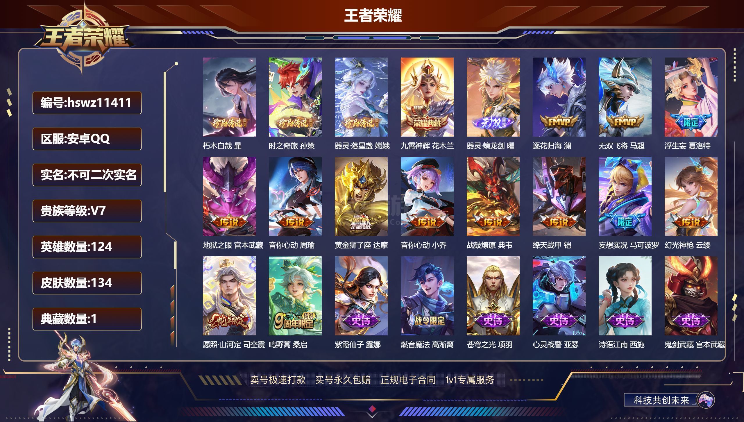 安卓QQ/至尊星耀/134皮肤/124英雄/1典藏/0珍品无双/1无双/3珍品传说/13传说/42史