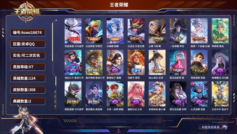 安卓QQ/荣耀黄金/308皮肤/124英雄/2典藏/0珍品无双/0无双/1珍品传说/5传说/92史诗