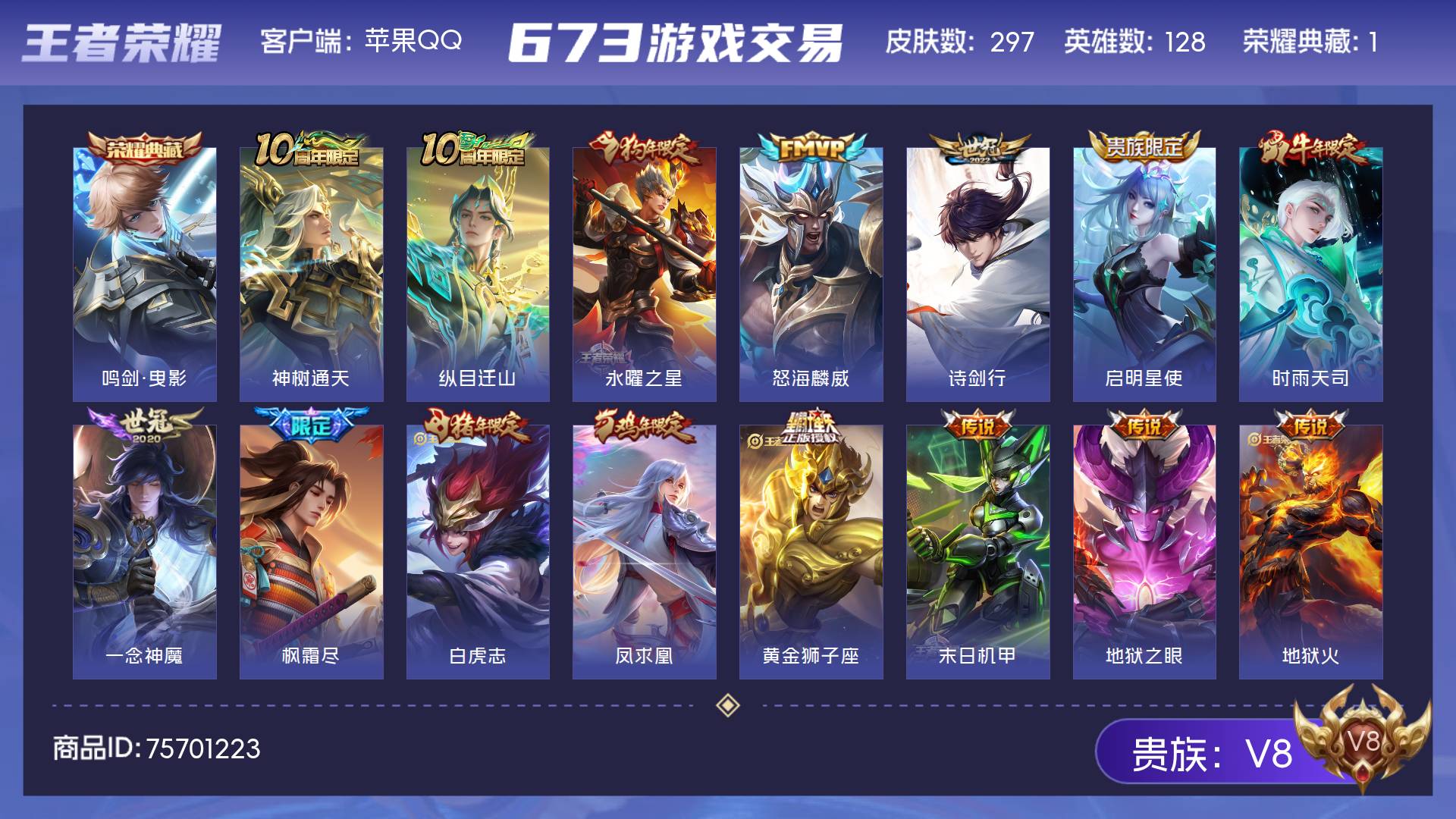 V8 皮肤297 英雄128 至尊星耀 荣耀典藏1 星传说3 传说17 其他皮肤285