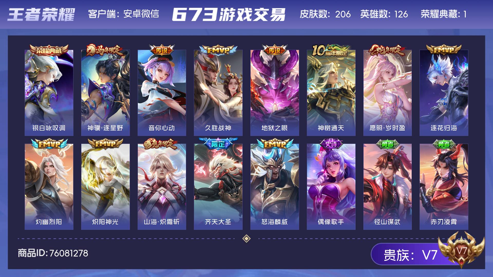 V7 皮肤206 英雄126 绝世王者 荣耀典藏1 传说12 其他皮肤199