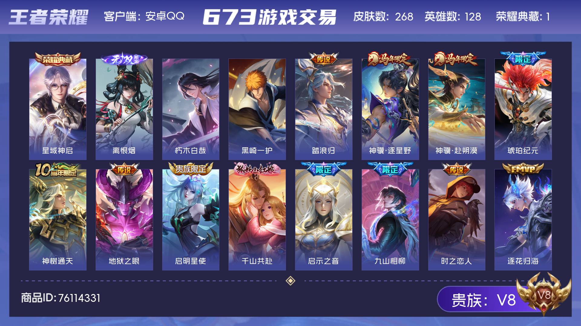V8 皮肤268 英雄128 至圣王者 荣耀典藏1 无双皮肤1 珍品传说2 星传说3 传说22 其他皮肤248
