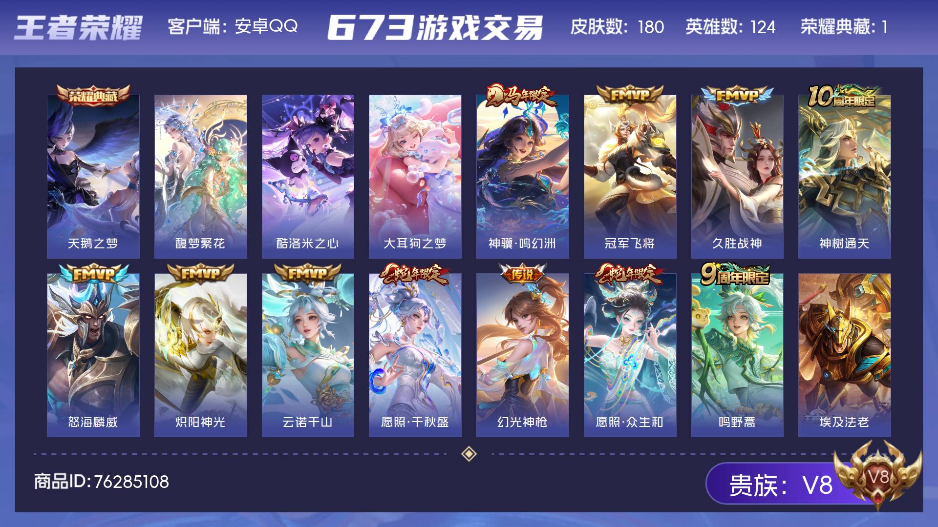 V8 皮肤180 英雄124 至尊星耀 荣耀典藏1 珍品无双1 珍品传说2 传说11