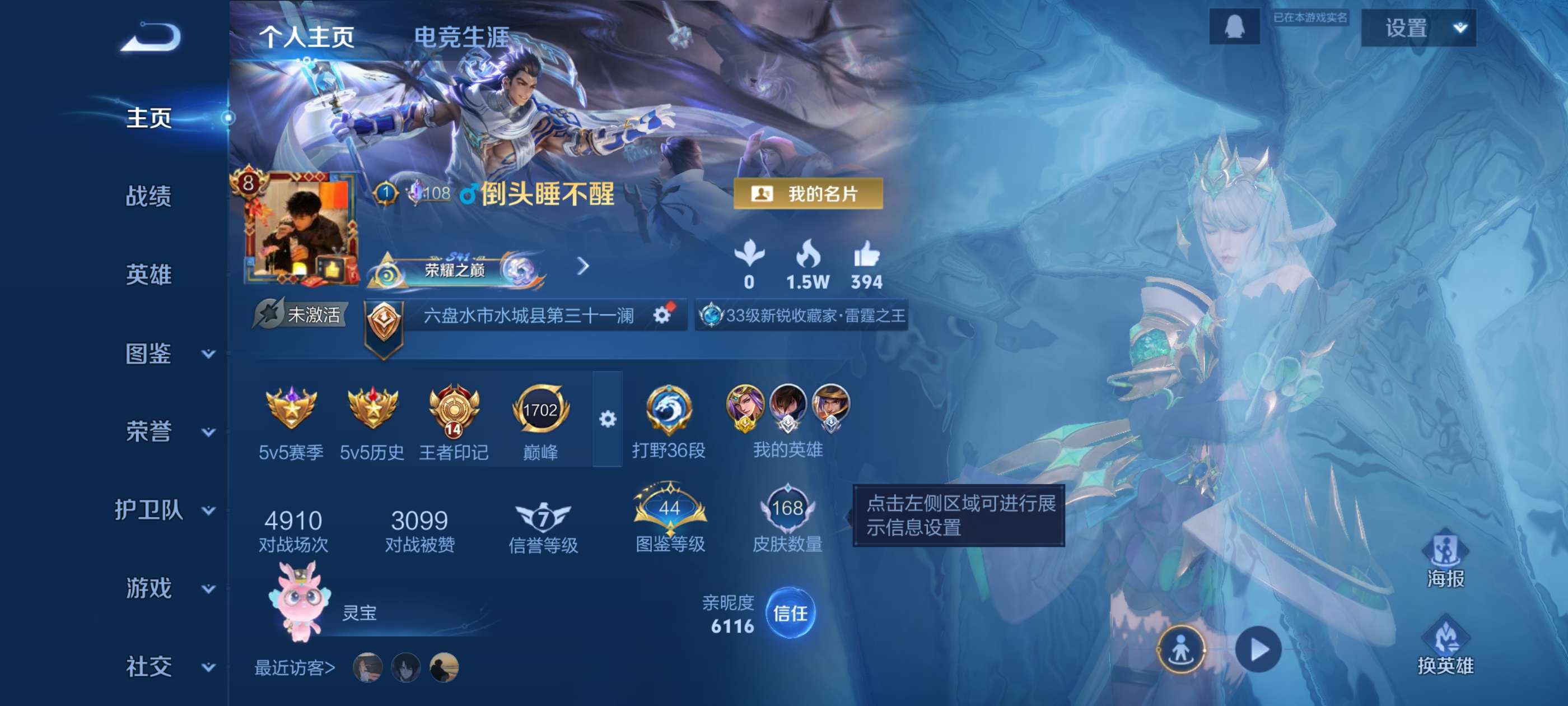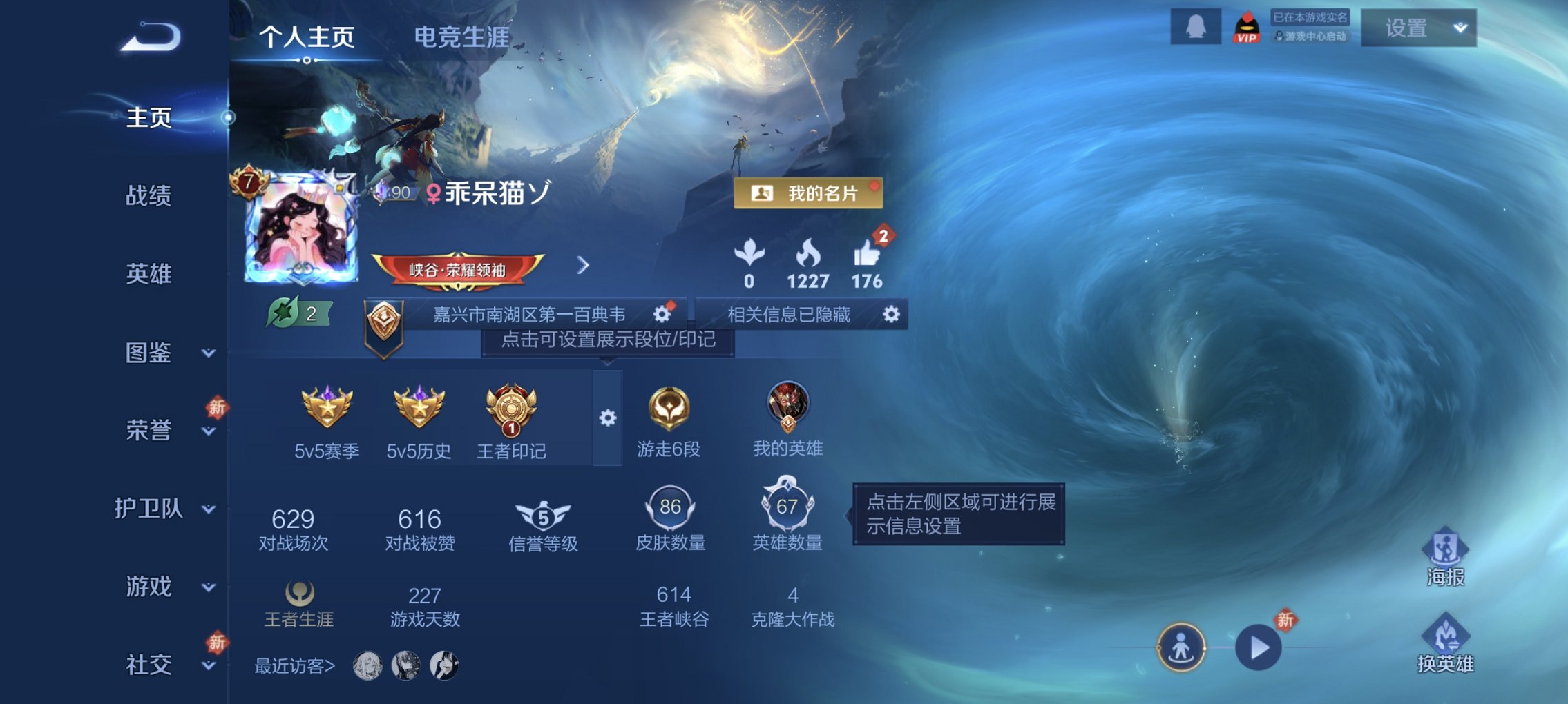 【准V9,差554升级V9】 贵族等级: V8 英雄数: 128 皮肤数: 3