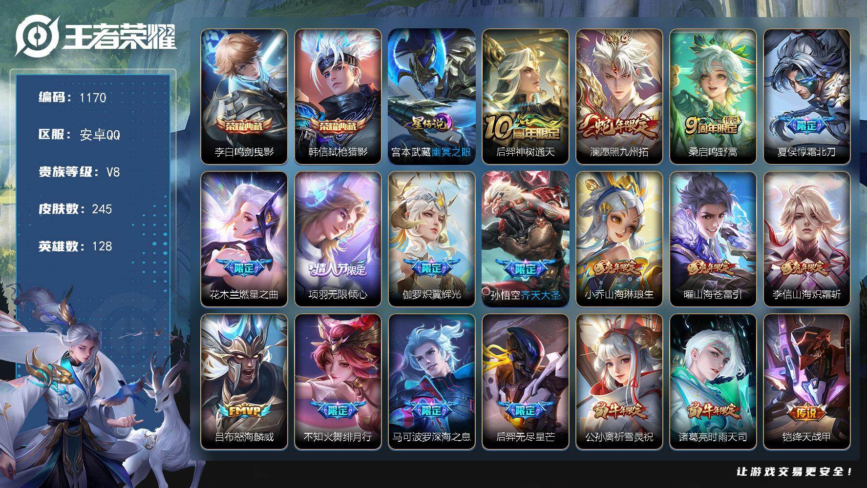 安卓Q-V8-最强王者段位-128英雄-247皮肤-2典藏皮肤-19传说-82史