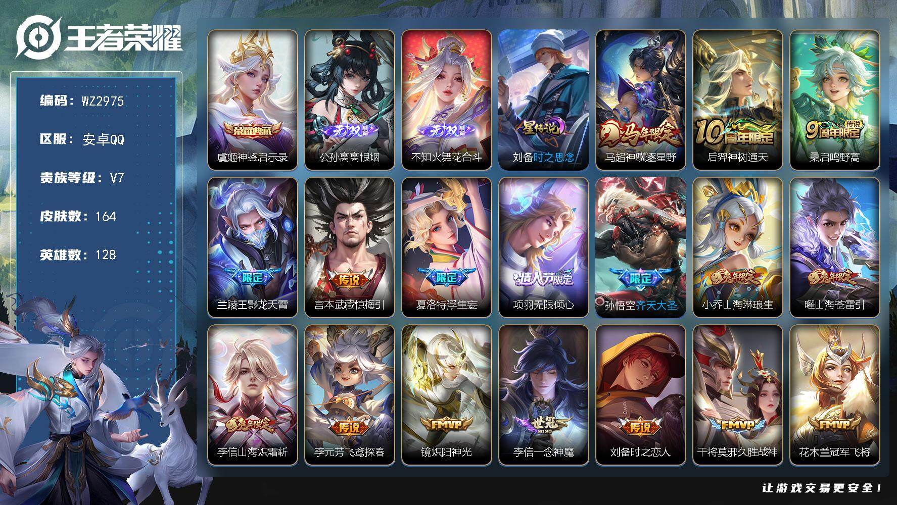 【秒换绑】安卓Q-V7-永恒钻石I段位-128英雄-164皮肤-1典藏皮肤-2