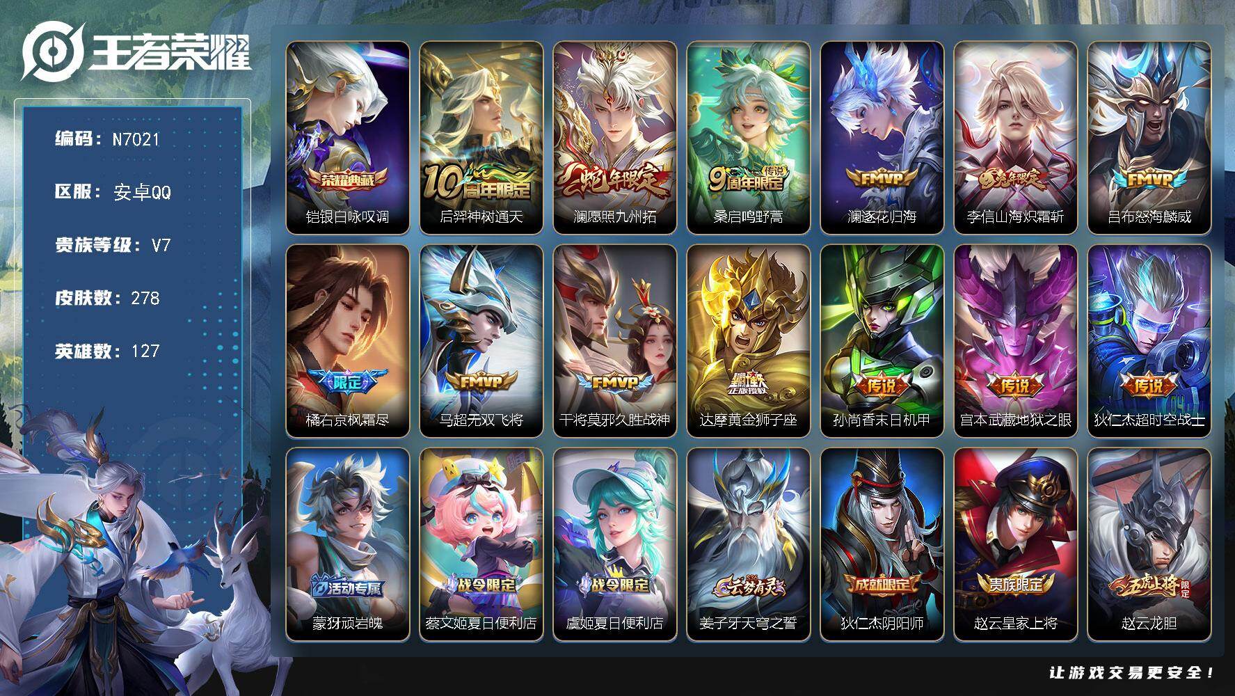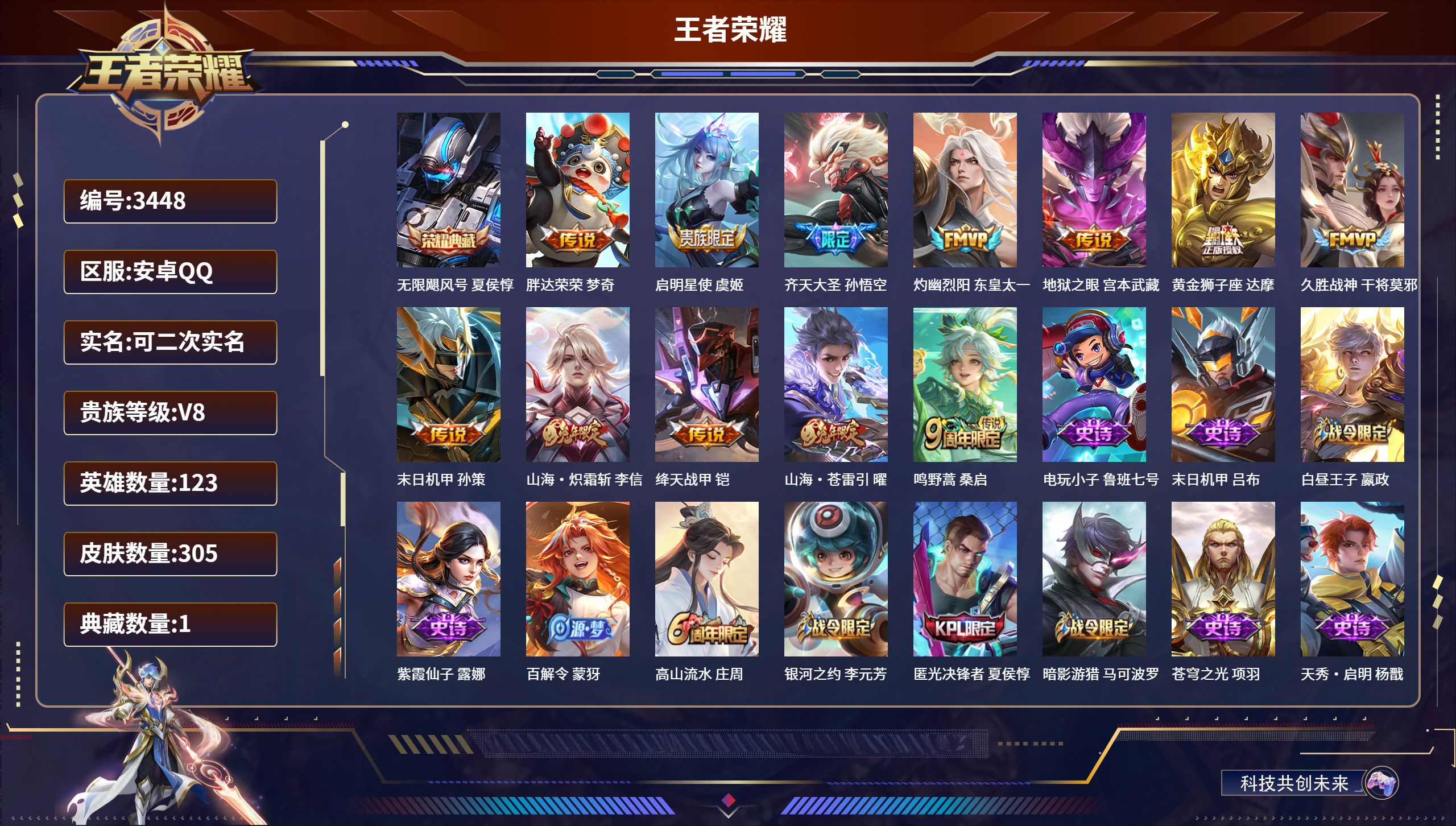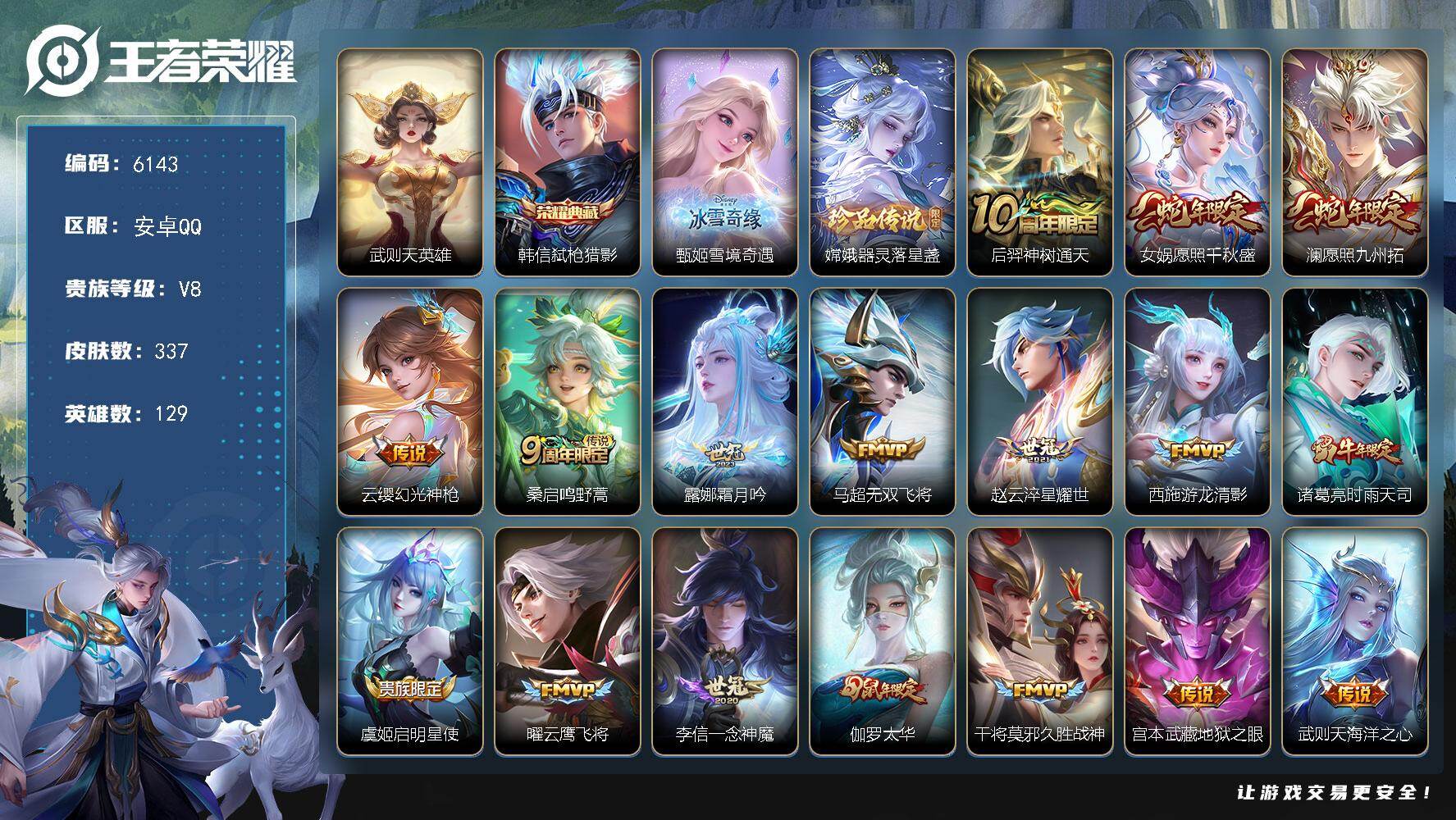 【W6075】安卓Q区-可二次-贵8-127英雄-322皮肤-3典藏-2珍品传