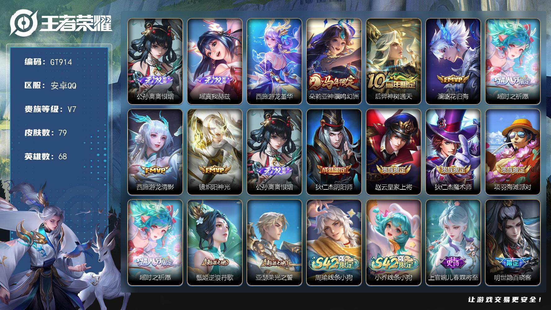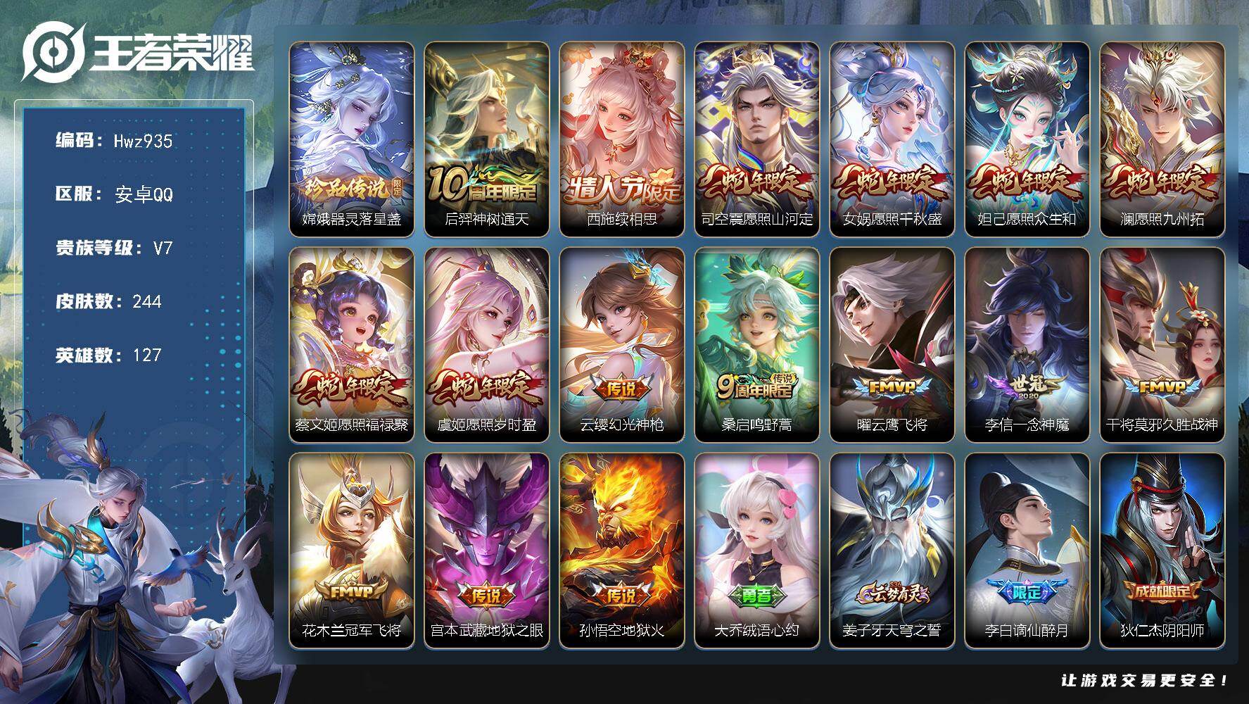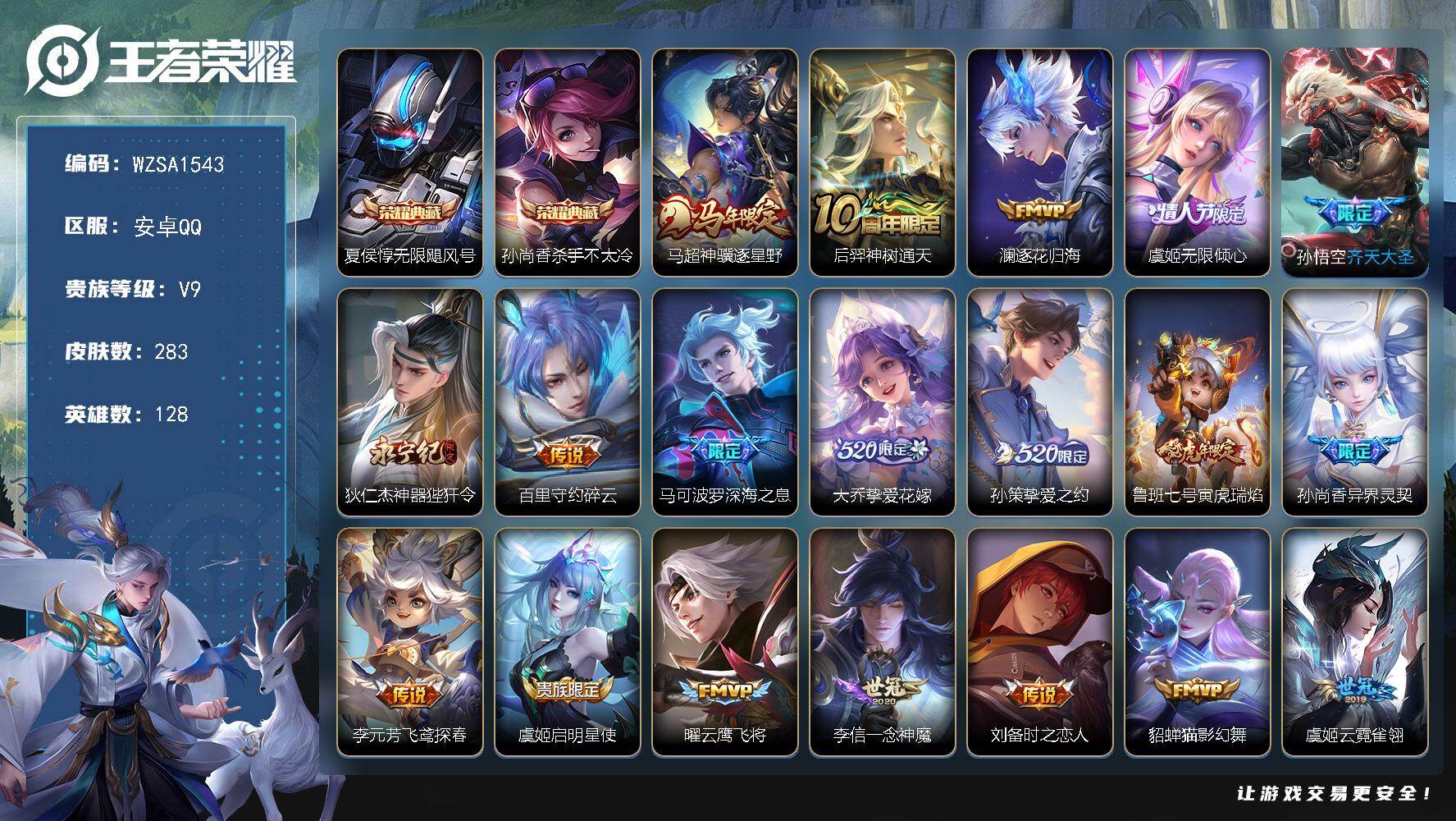 安卓QQ/荣耀王者/261皮肤/126英雄/2典藏/0珍品无双/0无双/3珍品传说/8传说/72史诗
