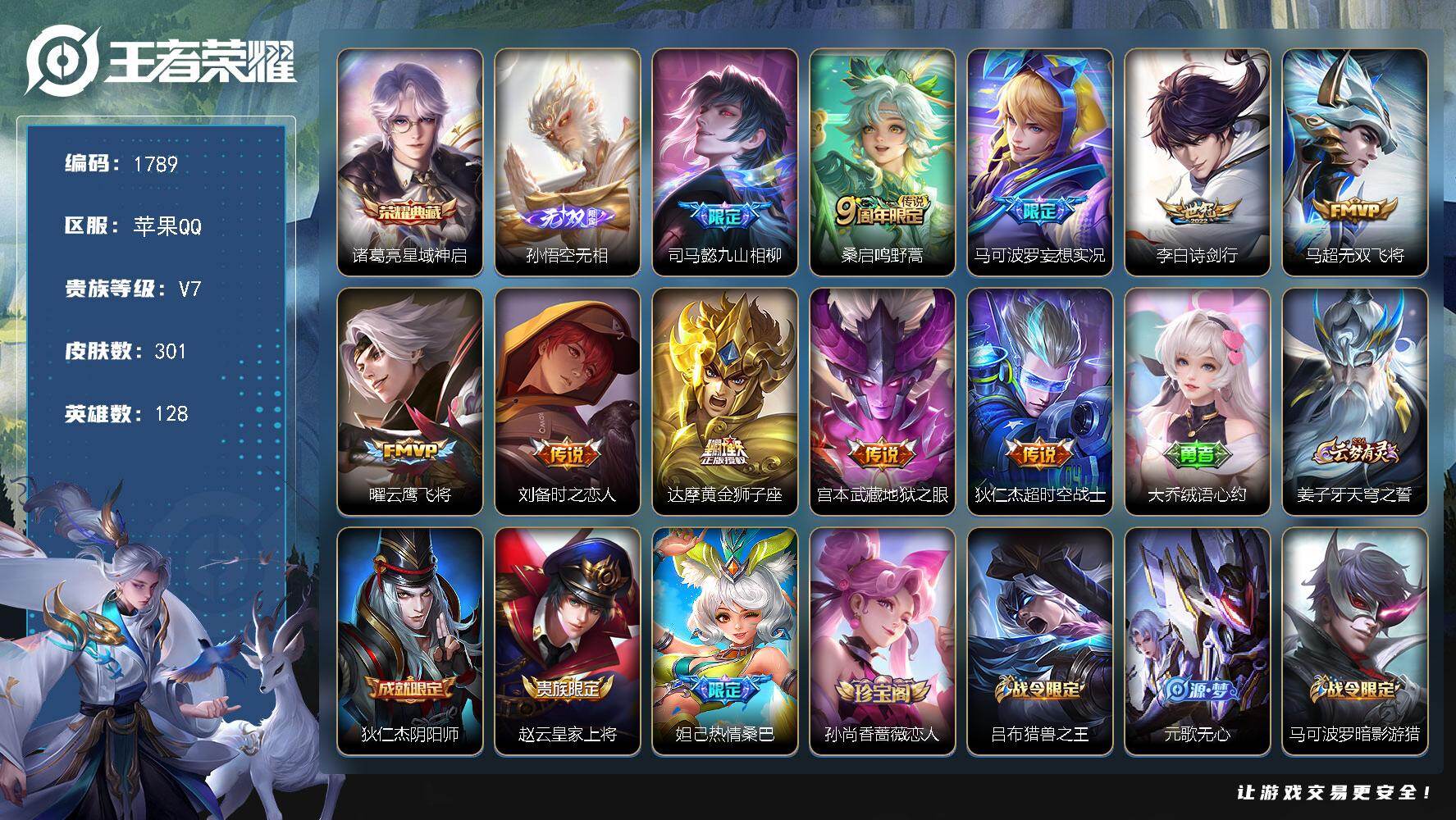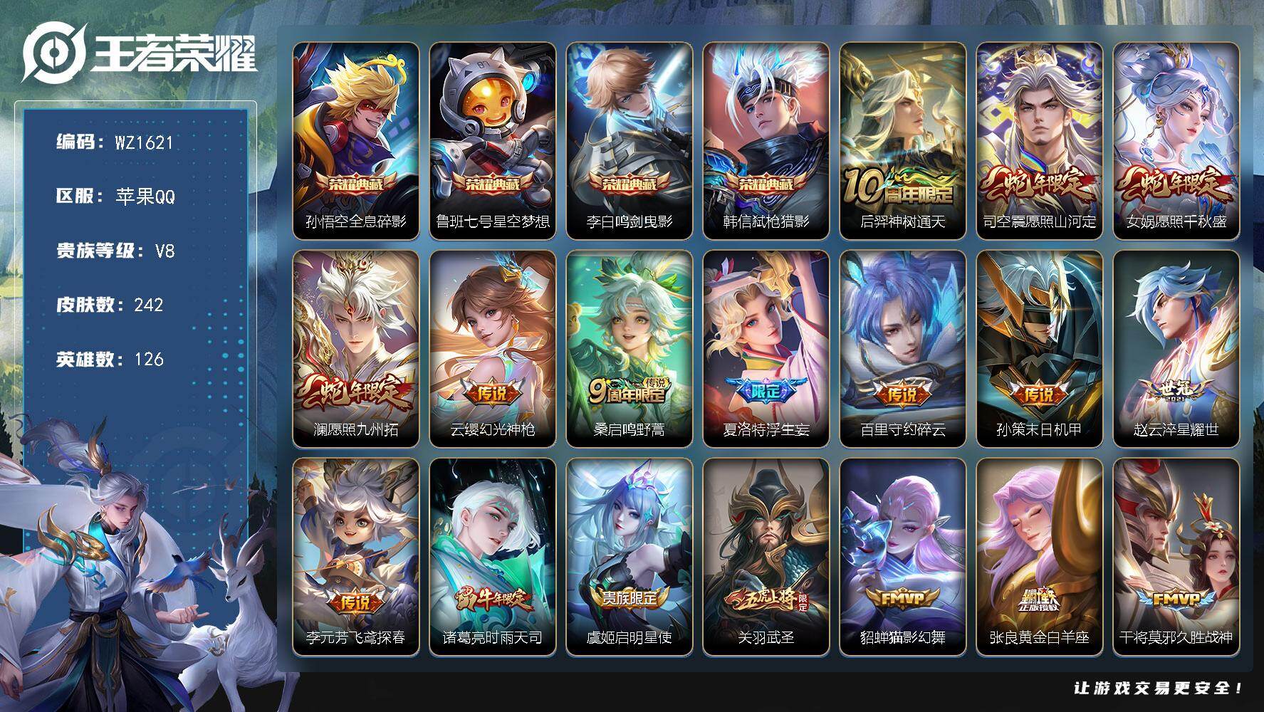 【秒换绑】苹果Q-V8-至尊星耀II段位-126英雄-242皮肤-4典藏皮肤-