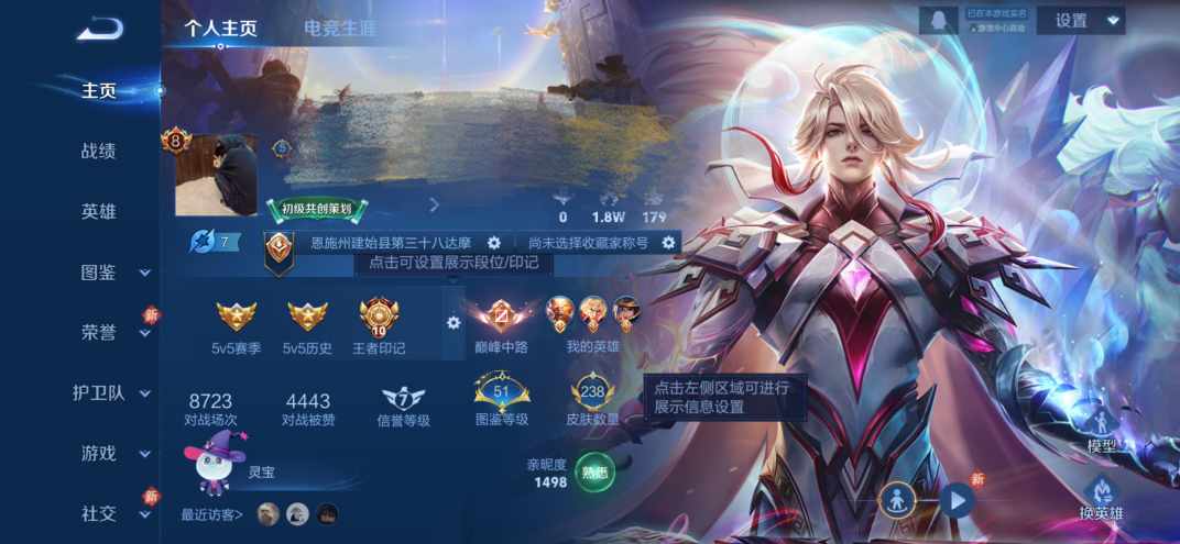 实名: 可修改 贵族等级: V8 英雄数: 127 皮肤数: 253 荣耀水晶