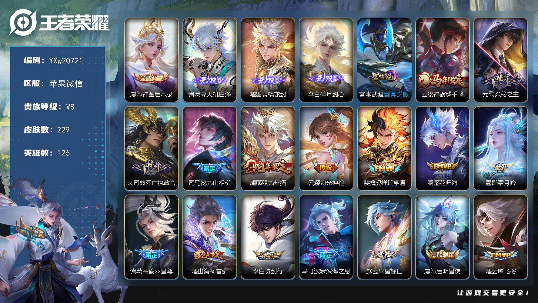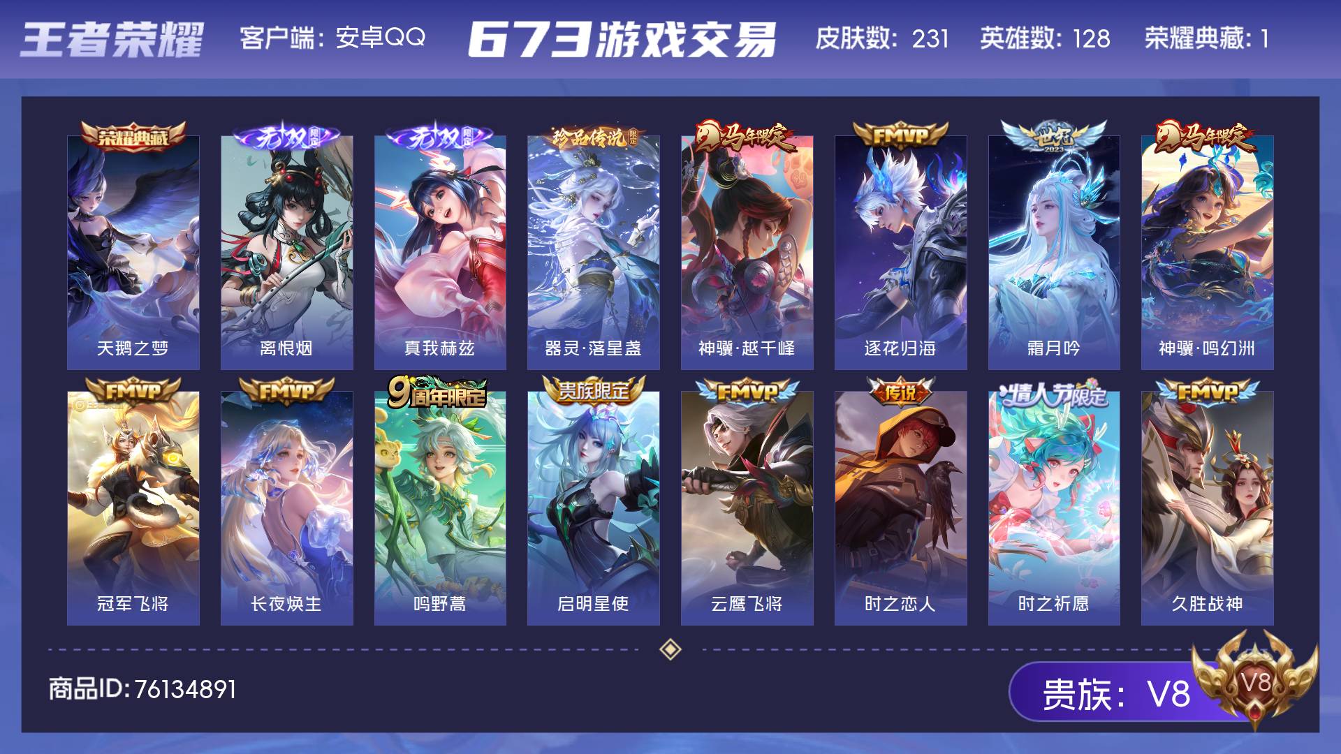 V8 皮肤231 英雄128 绝世王者 荣耀典藏1 无双皮肤2 珍品传说1 星传说1 传说19