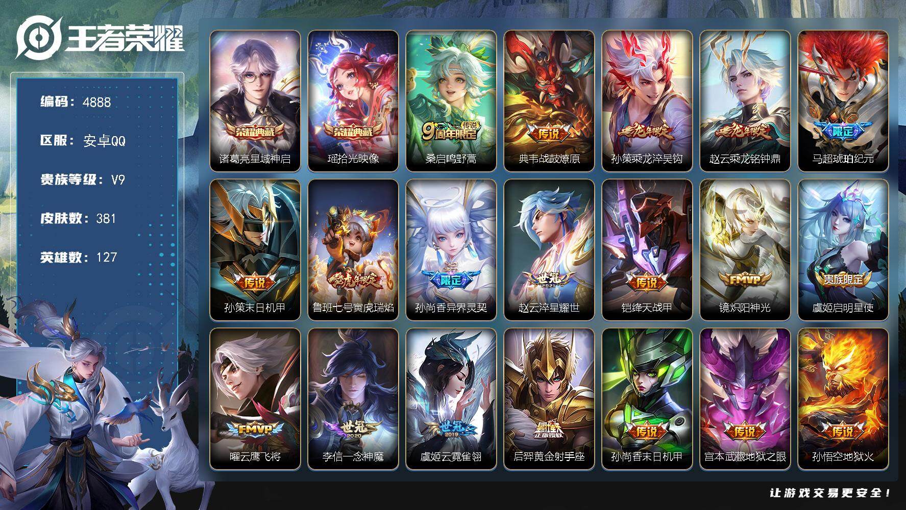 贵族9/皮肤381/典藏2/传说19/史诗112/英雄127/狂铁全皮/盾山全皮