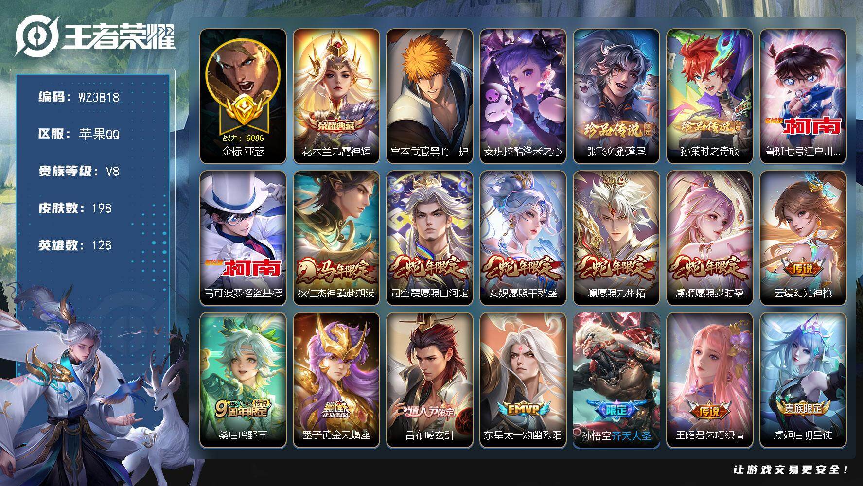【秒换绑】苹果Q-V8-【金标亚瑟】最强王者段位-128英雄-198皮肤-1典