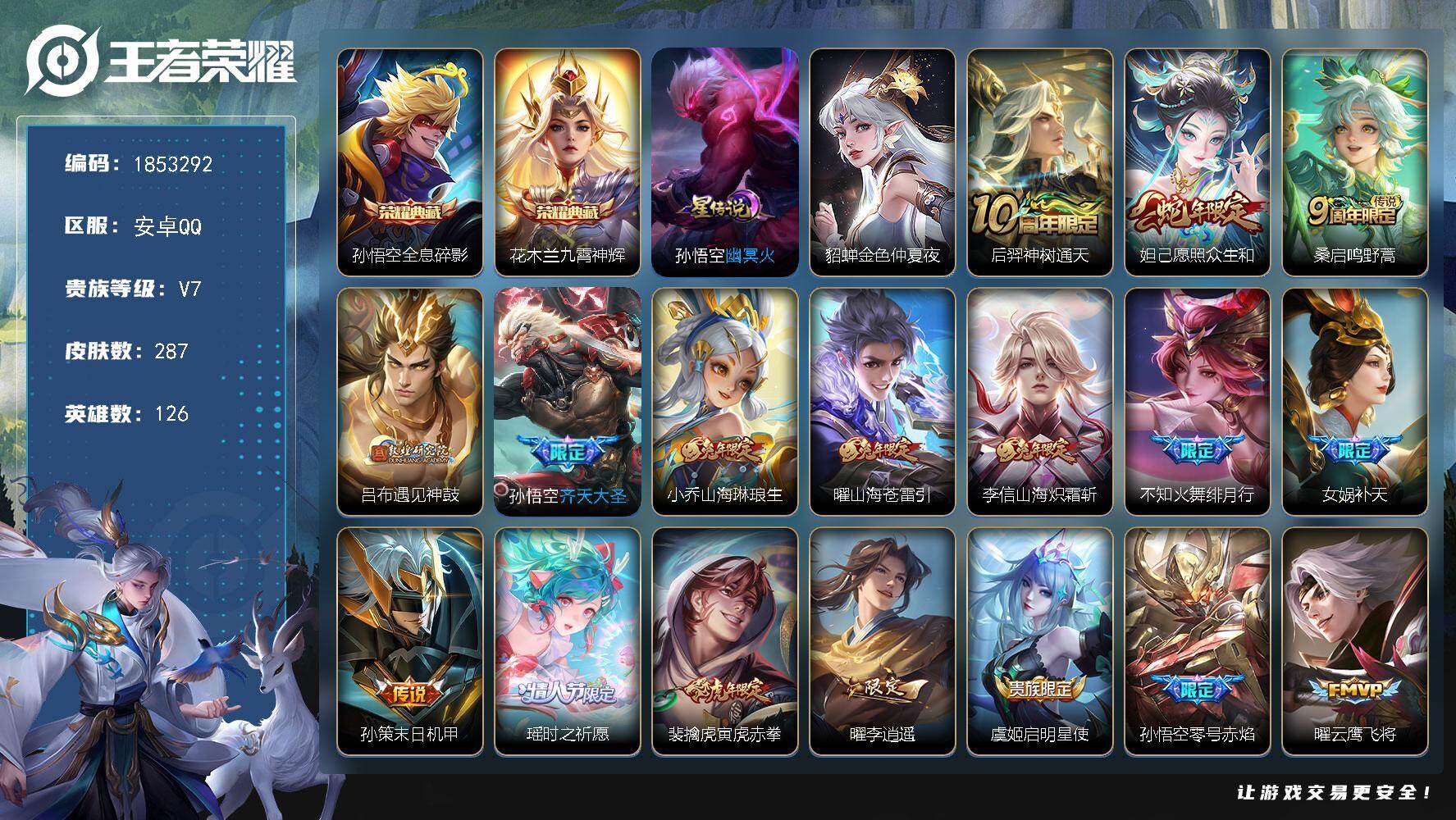 V8-最强王者段位-127英雄-280皮肤-2典藏皮肤-18传说-76史