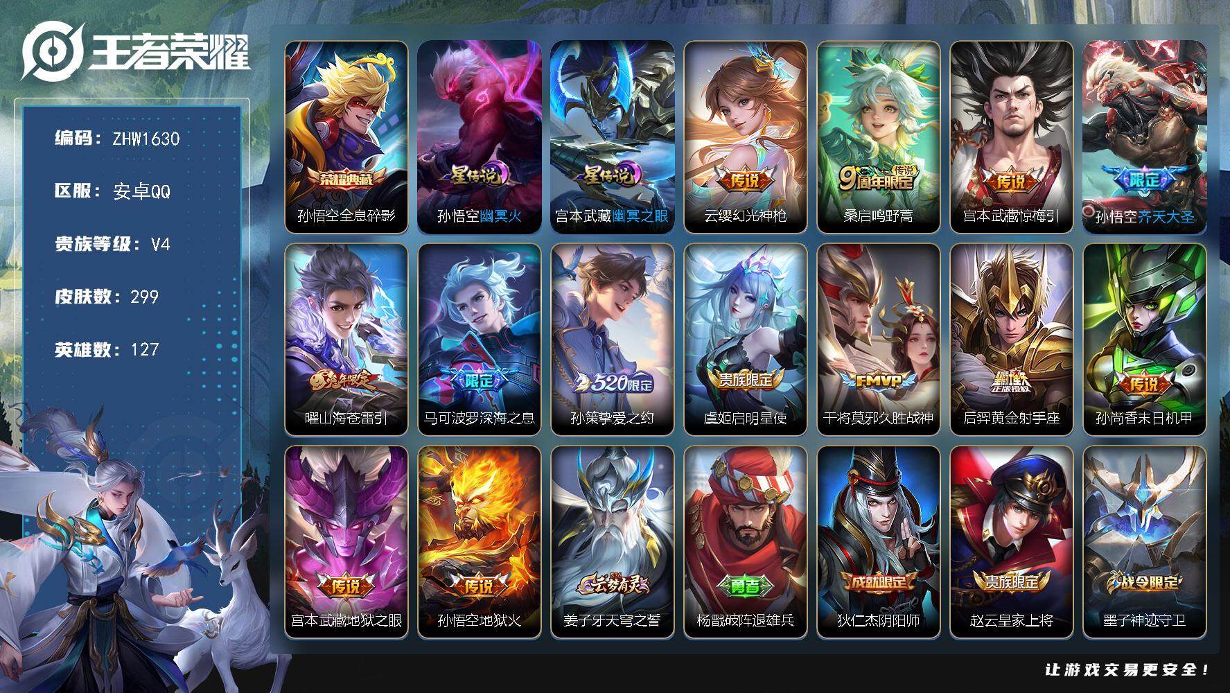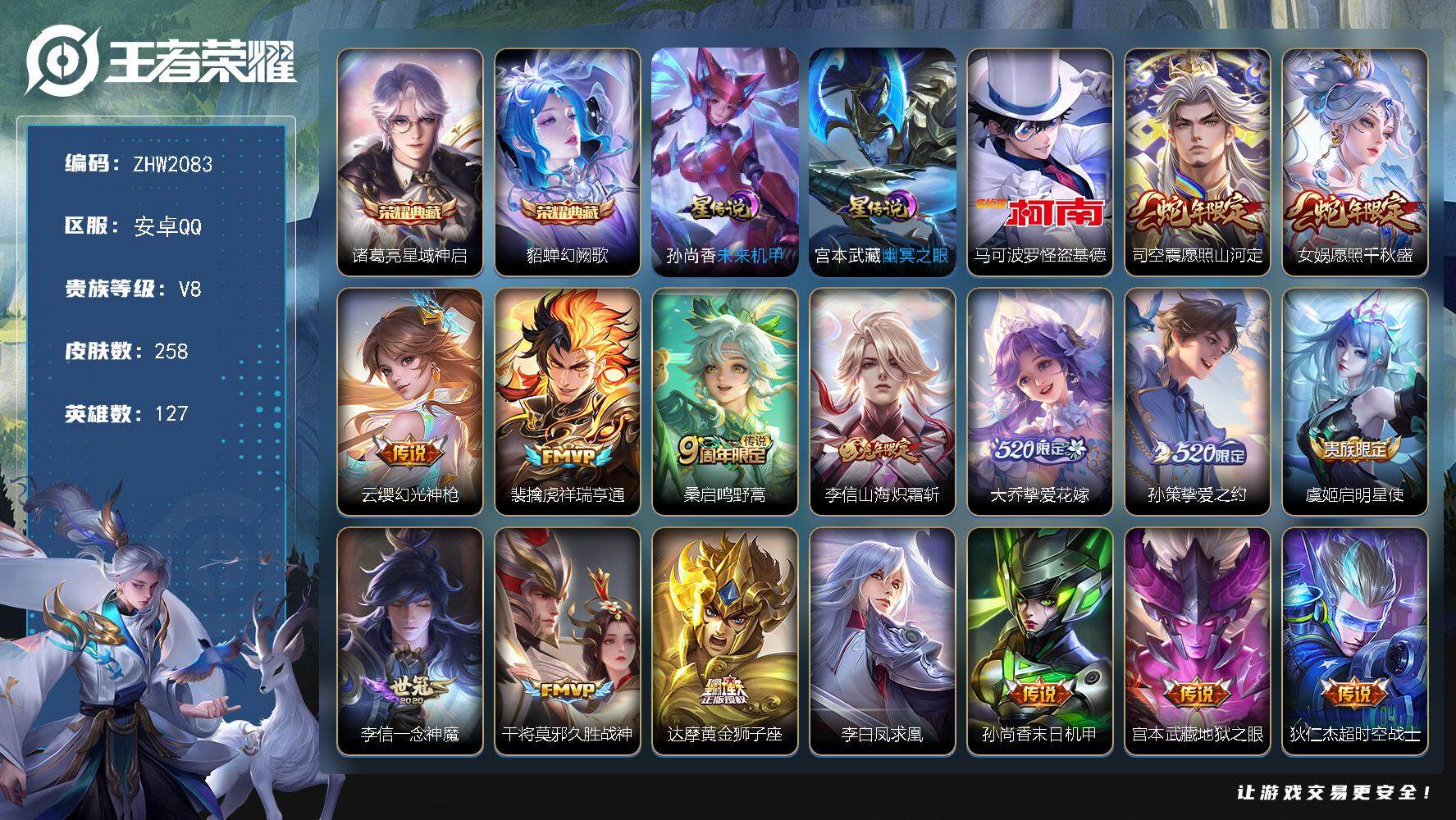 安卓Q-V8-最强王者段位-127英雄-258皮肤-2典藏皮肤-1珍品传说-16传说-72史诗
