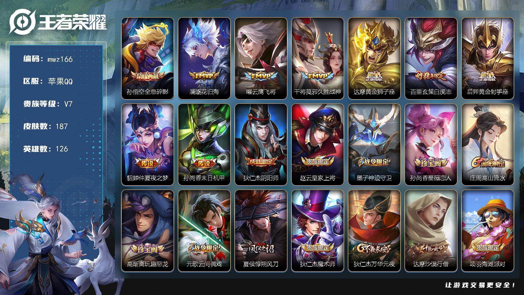 苹果QQ-1典藏-8传说-187皮肤-126英雄-荣耀王者-苹果Q-V7-最强王者段位-126英雄-187皮肤-1典藏皮肤-8传说-49史