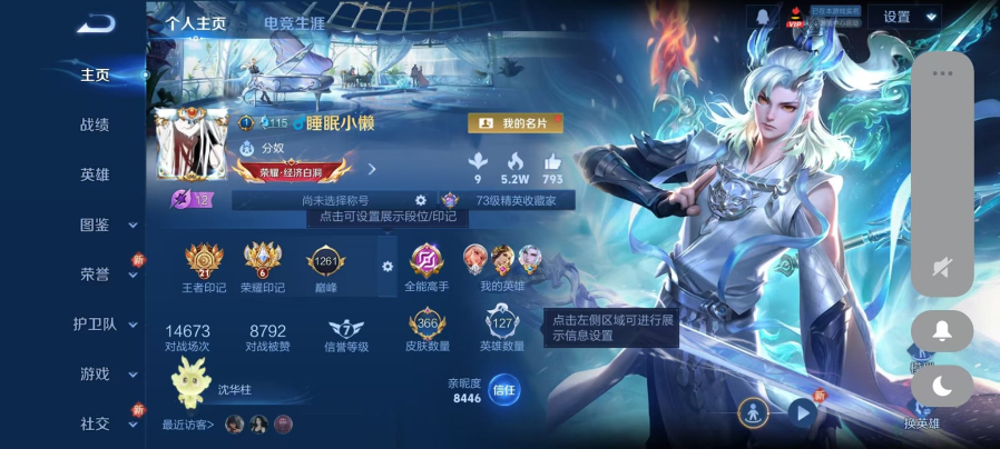 实名: 可修改 贵族等级: V8 英雄数: 127 皮肤数: 313 荣耀水晶