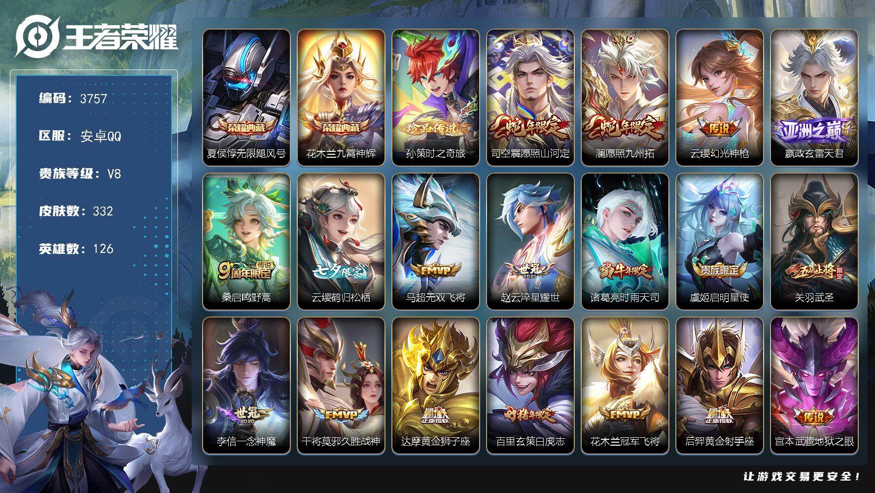 安卓Q-V8-最强王者段位-126英雄-332皮肤-2典藏皮肤-1珍品传说-1
