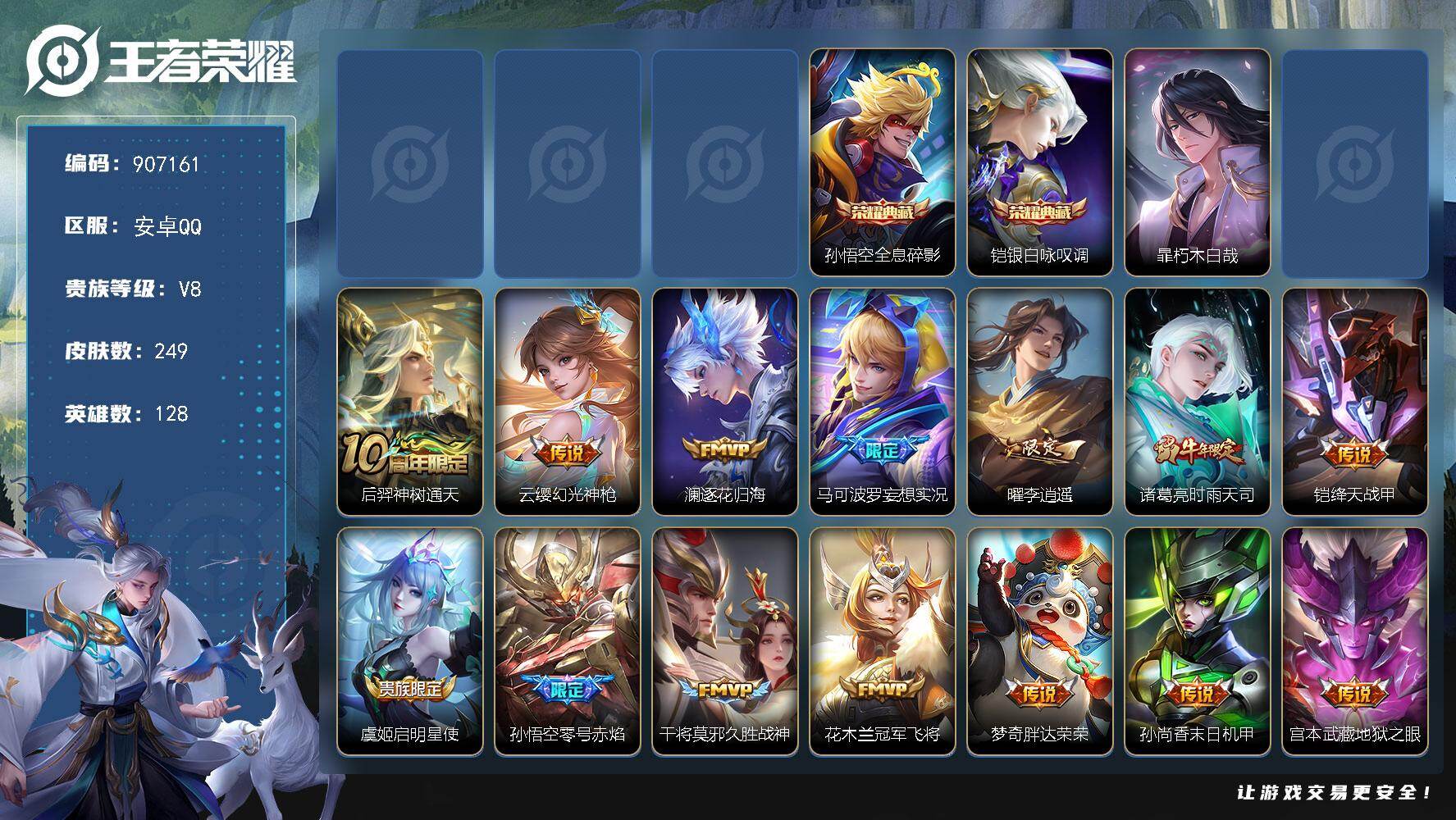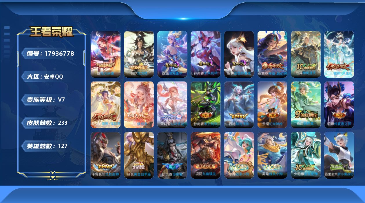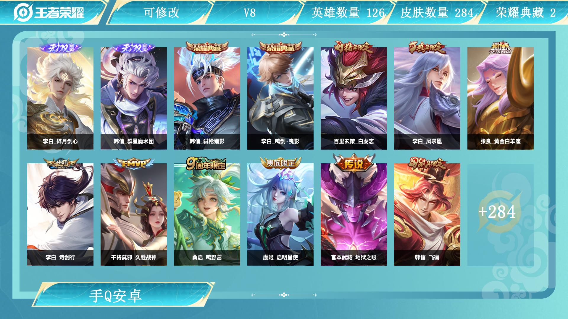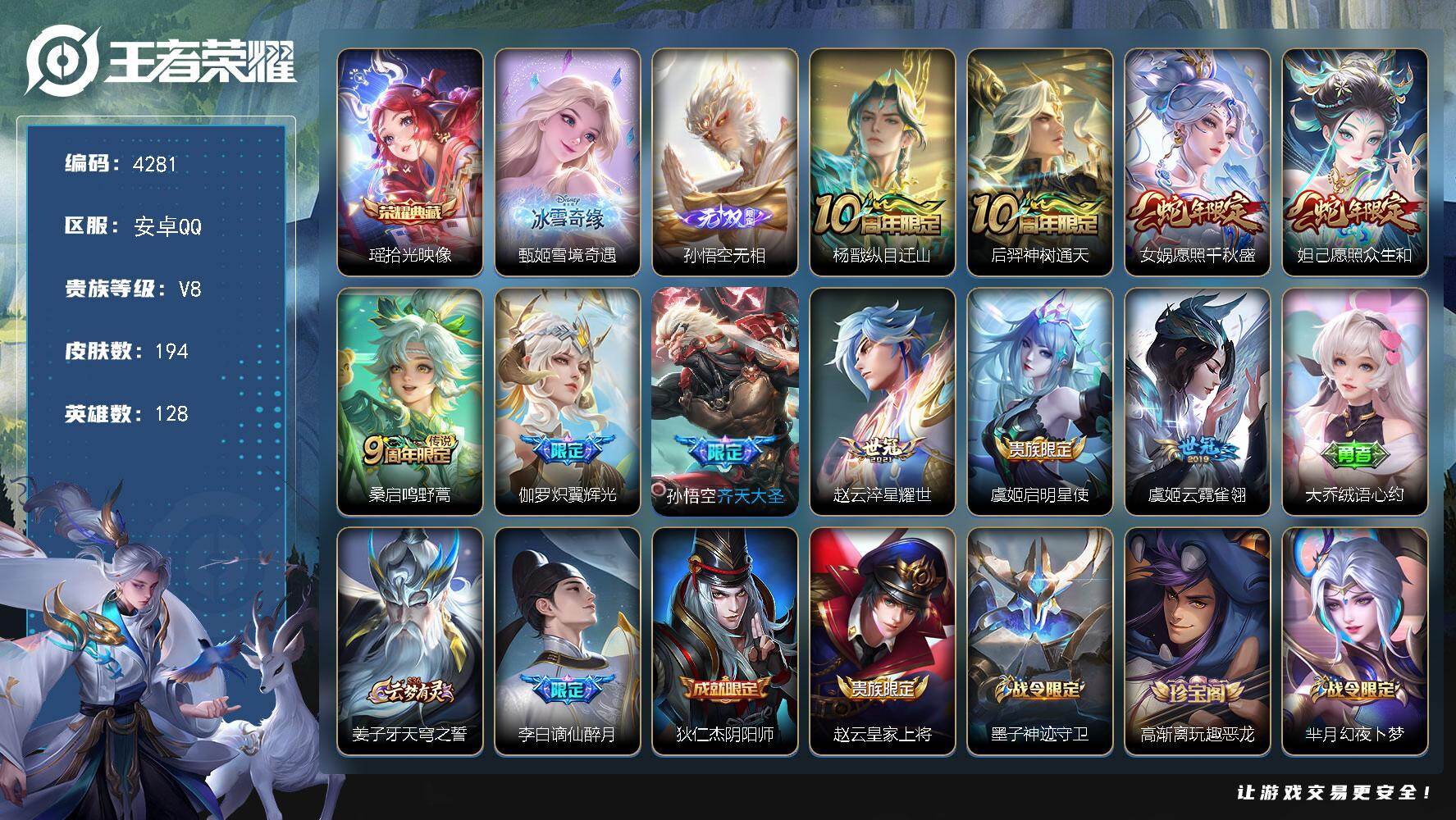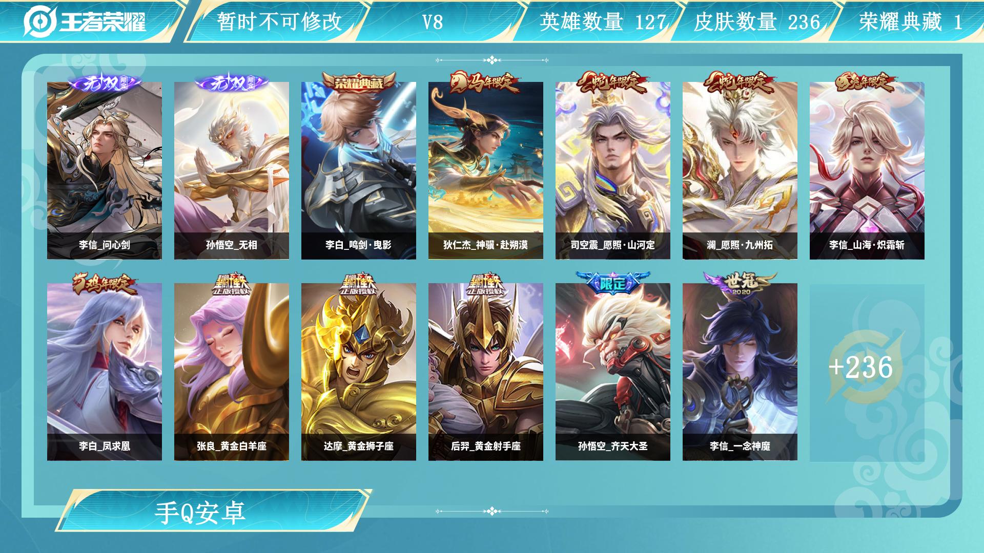 安卓WX-V8-最强王者段位-128英雄-201皮肤-1典藏皮肤-1无双-2珍品