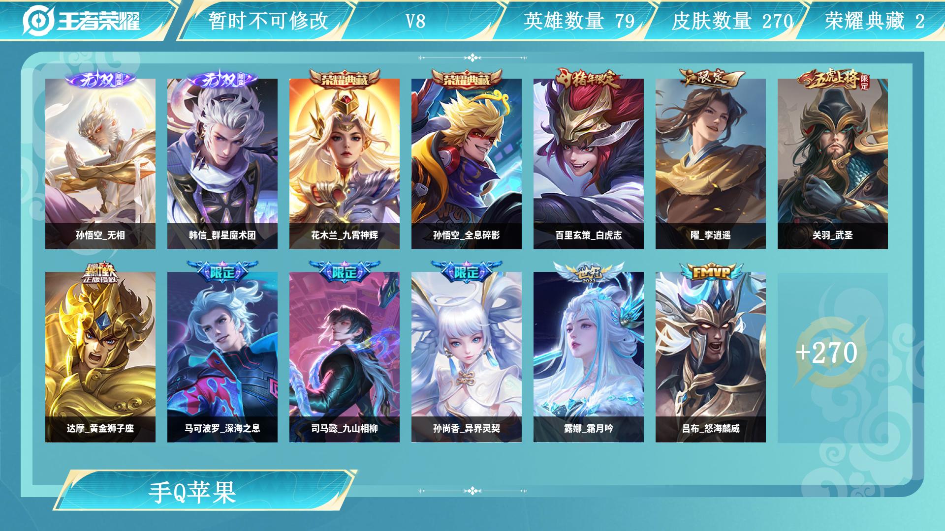皮肤数量270印记总数14V8至尊星耀暂时不可修改账号类型2