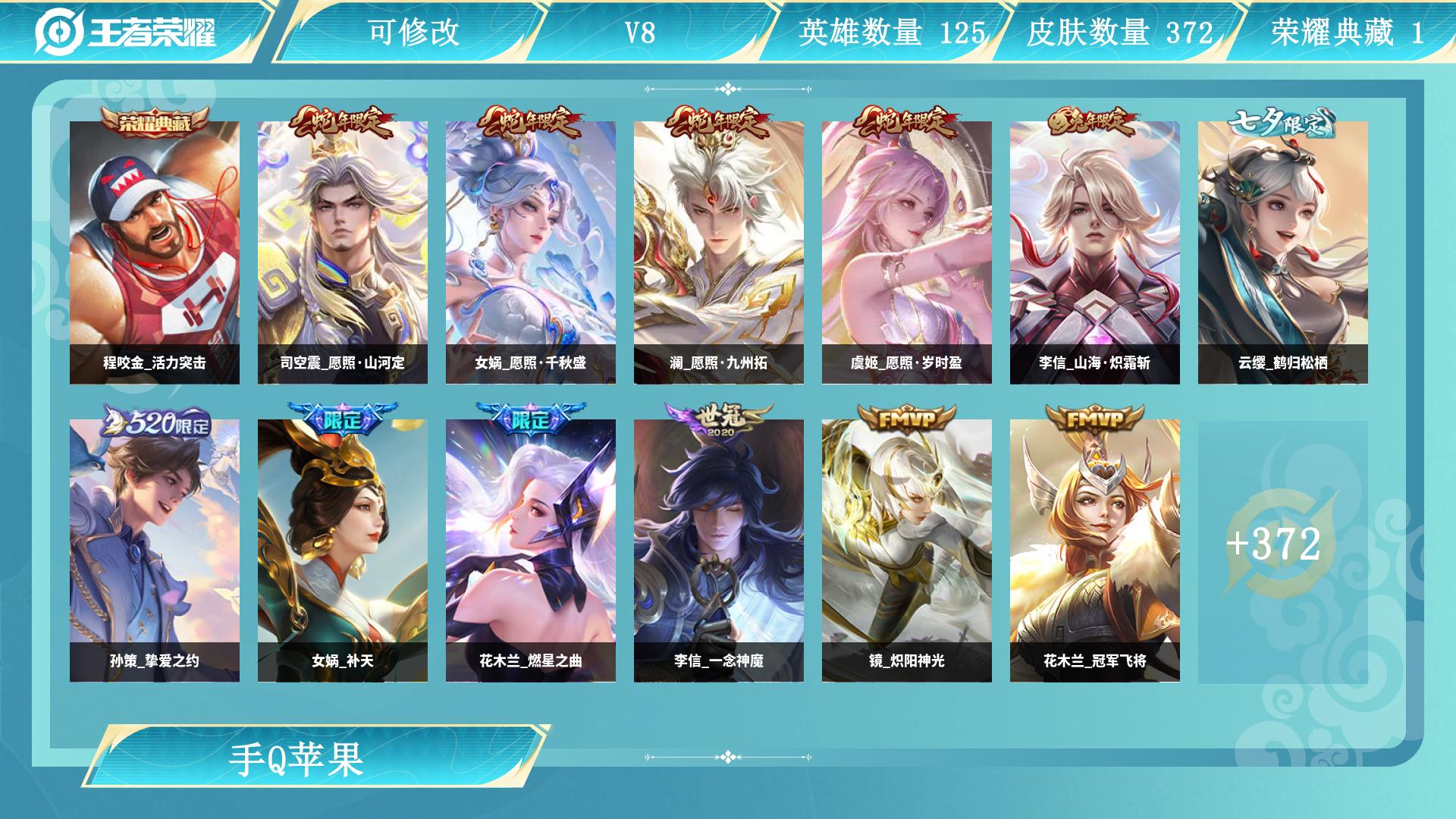 实名: 可修改 贵族等级: V9 英雄数: 126 皮肤数: 343 荣耀水晶