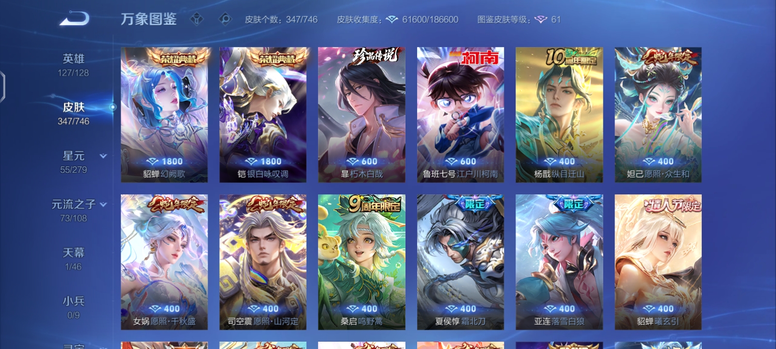 V9 皮肤346 英雄129 非凡王者 荣耀典藏3 珍品传说1 传说24 其他皮肤325