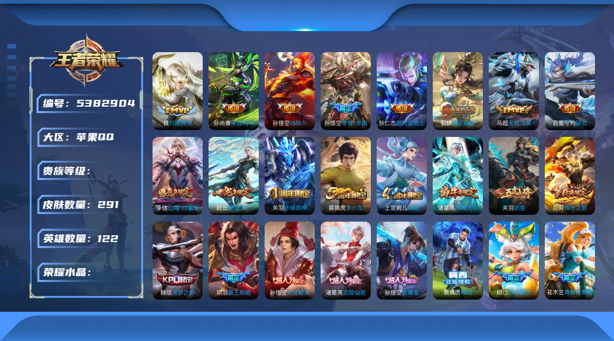 苹果QQ/荣耀王者/236皮肤/126英雄/0典藏/0珍品无双/1无双/2珍品传说/20传说/63史