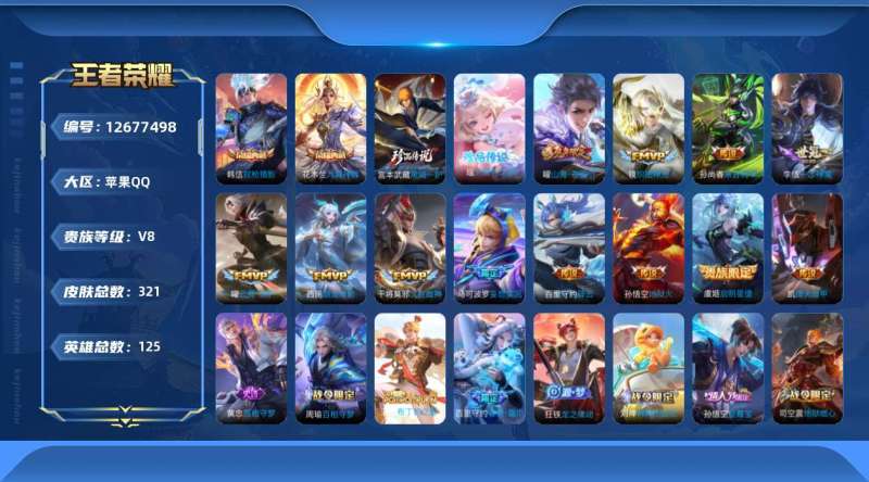 苹果QQ/至尊星耀/265皮肤/127英雄/1典藏/0珍品无双/1无双/2珍品传说/12传说/68史