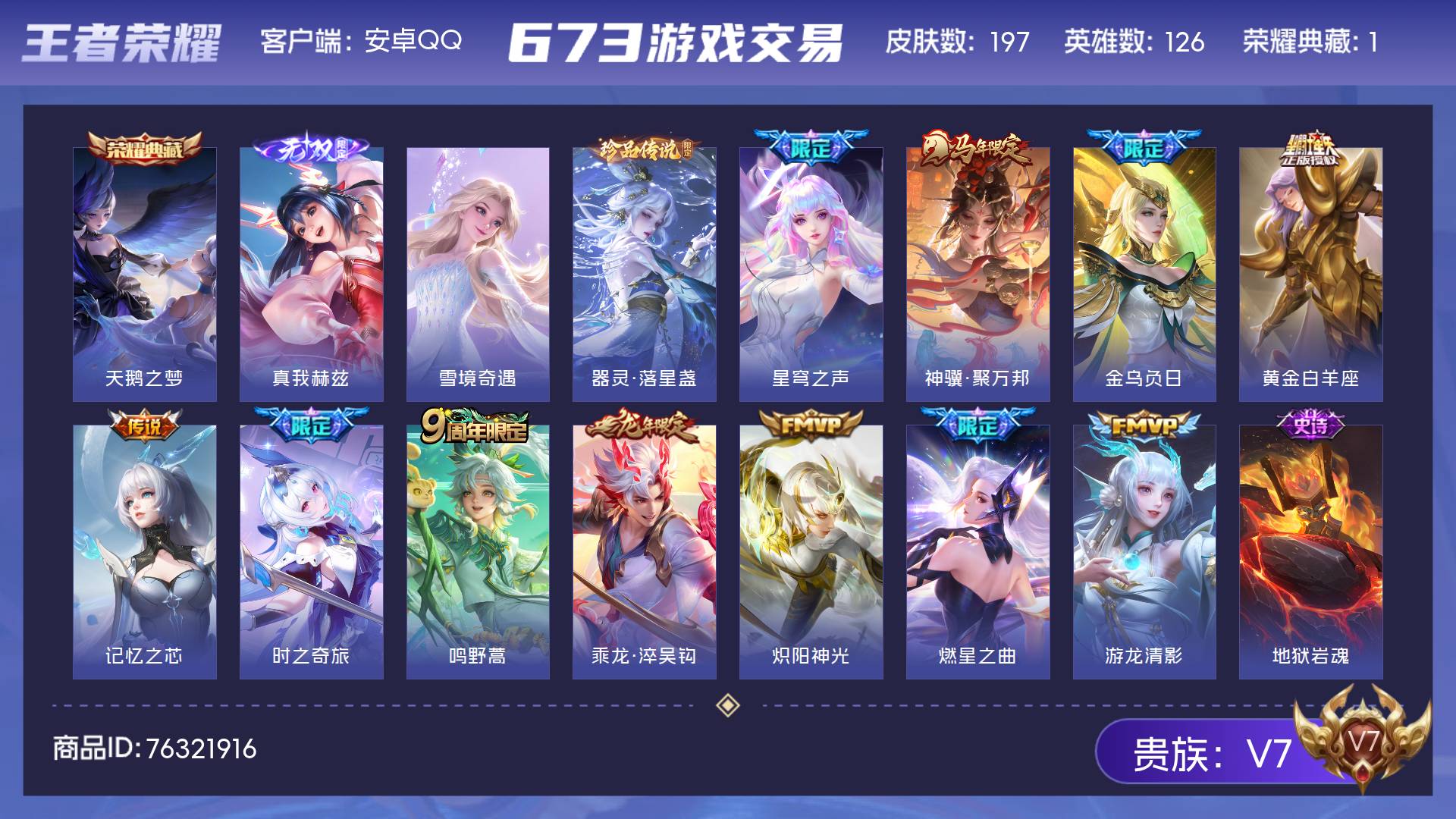 V7 皮肤197 英雄126 绝世王者 荣耀典藏1 无双皮肤2 珍品传说1 传说11