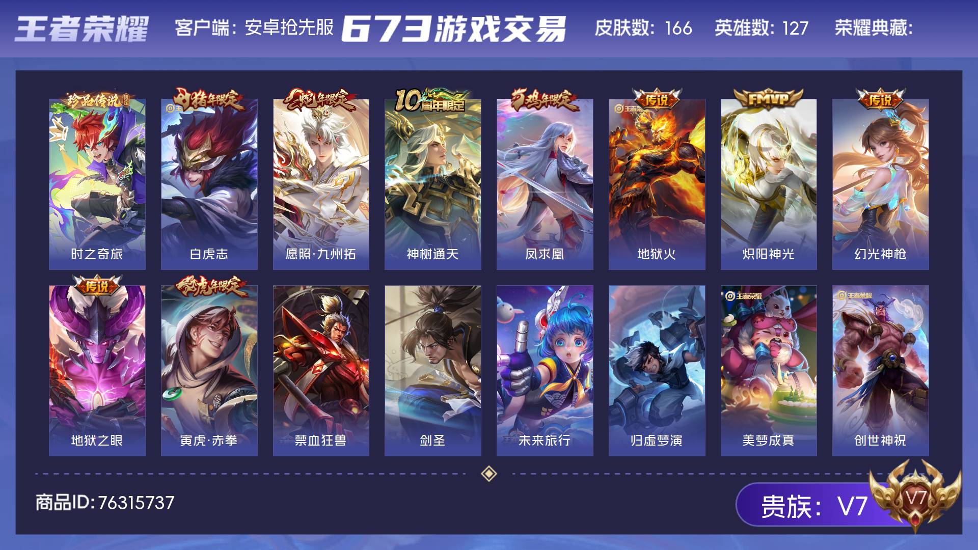 V7 皮肤166 英雄127 至尊星耀 珍品传说1 星传说1 传说9